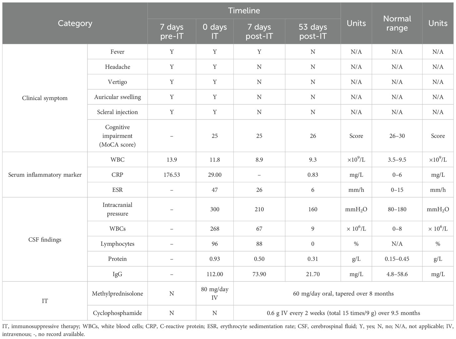 The management of RP with CNS involvement remains challenging due to the rarity of such cases and the lack of standardized treatment protocols. Current approaches are largely empirical. High-dose glucocorticoid pulse therapy serves as the primary treatment modality. However, some case reports indicate an insufficient initial therapeutic response or a tendency to relapse when tapering is too rapid (3, 8, 27). For patients with glucocorticoid-refractory disease or those requiring long-term oral glucocorticoids, combination therapy with other agents (such as cyclophosphamide, intravenous immunoglobulin, or infliximab) may be considered (15, 28). In this case, the patient continued to experience intermittent low-grade fevers during treatment with 80 mg/day of methylprednisolone. Complete symptom resolution was achieved following the addition of cyclophosphamide, and no relapse occurred during the 1-year follow-up period.