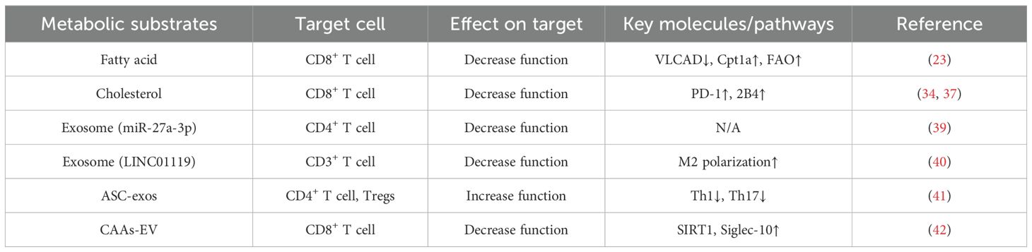 Research by Fan et al. has revealed intriguing insights into the role of miRNAs in adipocyte-derived exosomes in lung adenocarcinoma. Specifically, they found that downregulation of miR-27a-3p in exosomes derived from adipocytes inhibits the proliferation of CD4+ T cells and the secretion of IFN-γin vitro (39). In addition to miRNA, lncRNA also plays a role in it. LINC01119 is a differentially expressed lncRNA in ovarian cancer (OC). LINC01119 encapsulated by CAAs-derived exosomes promoted M2 polarization of macrophages, thereby inhibiting the proliferation of CD3+ T cells (40). What’s more, adipose-derived stem cell exosomes (ASC-exos) could be taken up by CD4+ T cells, thus inhibiting Th 1 and Th 17 differentiation and promoting Tregs differentiation. Through these effects, ASC-exos promoted breast cancer characterization and TME immunosuppression (41). Moreover, extracellular vesicles (EV), similar to exosomes, could mediate tumorigenesis. In OC, CAAs-EV delivered sirtuin 1(SIRT1) to OC cells. SIRT1 transcriptionally activated the expression of CD24, which up-regulated the expression of Siglec-10. Finally, the up-regulation of Siglec-10 promoted the apoptosis of CD8+ T cells, thereby promoting tumorigenesis in mice (42). These findings underscore the intricate interplay between adipocyte-derived exosomes and T cell function in the TME, shedding light on potential therapeutic targets for immune modulation in cancer therapy. In summary, adipocytes metabolic substrates have significant effects on T cells, and how them affect T cells through metabolic substrates is summarized in Table 1.