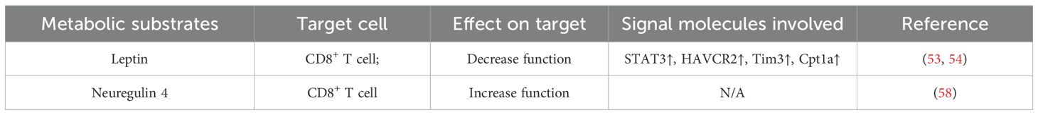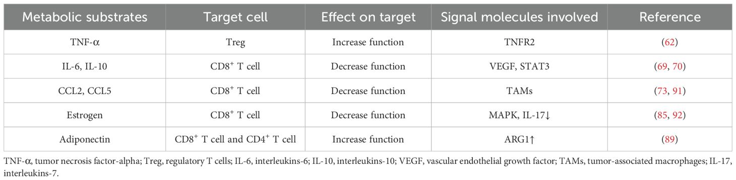 FAs and cholesterol, two prominent metabolic substrates released by adipocytes, have been shown to impair the function of CD8+ effector T cells, thus compromising their ability to mount effective anti-tumor responses. Additionally, adipocyte-derived factors such as exosomes, leptin, insulin, and estrogen have been implicated in inhibiting the function and activity of CD8+ T cells, further contributing to the establishment of an immunosuppressive TME.
