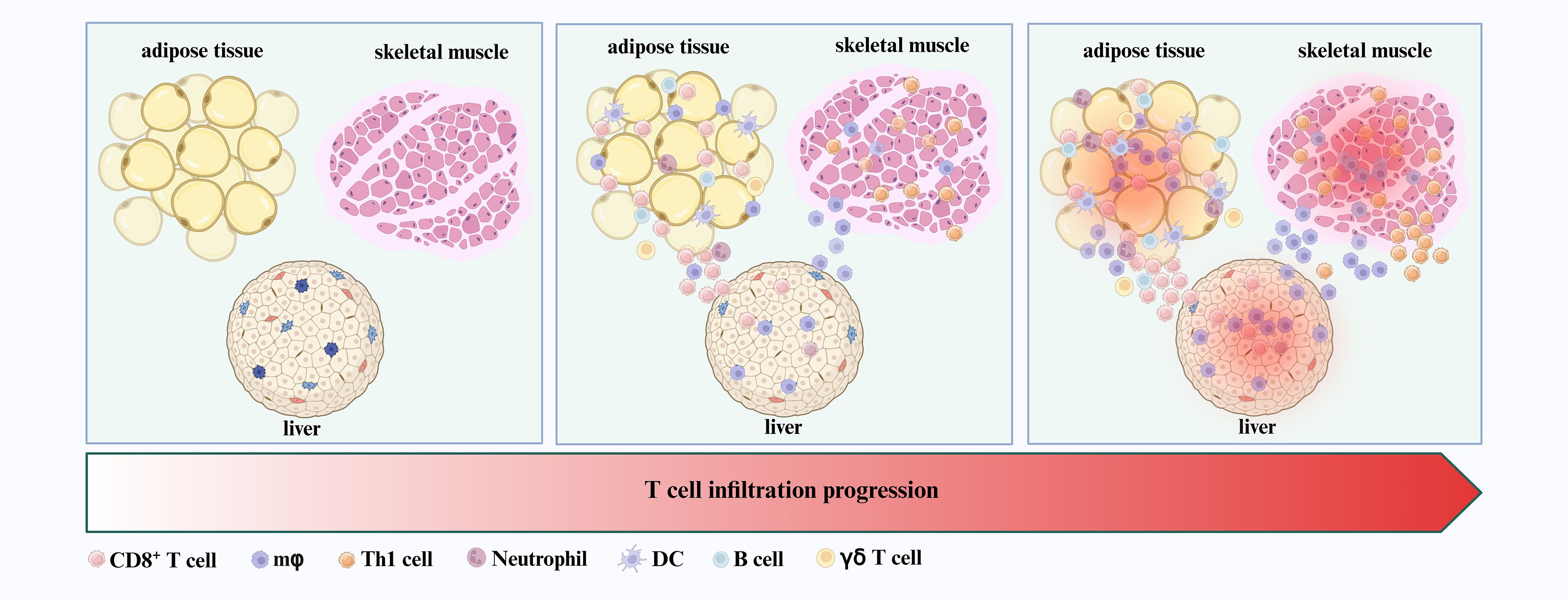 Figure 1. T cells as early infiltrators in insulin-responsive tissues. CD8+ T cells and Th1 cells, along with macrophages, neutrophils, DCs, B cells, and γδ T cells, are among the first immune populations to infiltrate insulin-responsive tissues—including adipose tissue, skeletal muscle, and liver—during the initial stages of T2DM development.