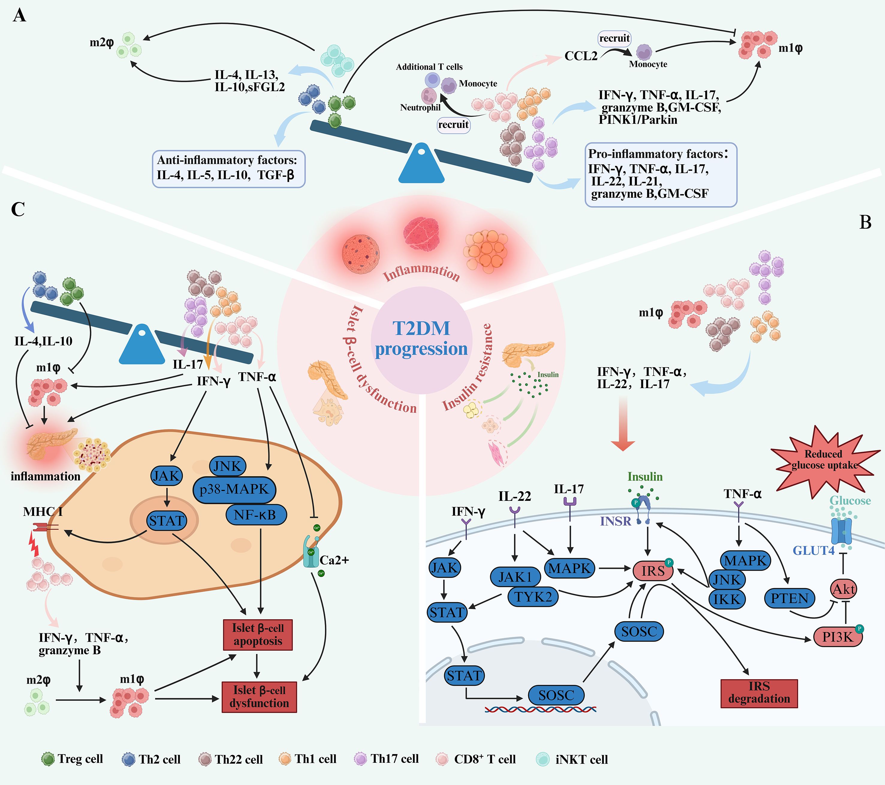 Figure 2. T cell subset imbalance contribute to the pathogenesis of T2DM. (A) In the progression of T2DM, the imbalance of T cell subsets is caused by the increase of pro-inflammatory T cells, including CD8+ T cells, Th17, Th22, and Th1 cells and the decrease of anti-inflammatory T cells, including Tregs and Th2 cells. This is accompanied by elevated levels of cytokines pro-inflammatory T cells secrete, such as IFN-γ, TNF-α, GM-CSF, granzyme B, IL-21, IL-22and IL-17. Conversely, anti-inflammatory subsets are reduced, leading to decreased secretion of cytokines including IL-5, IL-4, IL-10, and TGF-β. Both IFN-γ, TNF-α, IL-17, IL-22 and IL-21 secreted by pro-inflammatory T cells and CD8+ T cells recruiting monocytes through the release of CCL2 promote pro-inflammatory M1 macrophage polarization. In contrast, M2 macrophage polarization, which depends on cytokines like IL-10, IL-4, IL-13, sFGL2 and iNKT cells, is diminished. The interaction between T cells and macrophages establishes a pro-inflammatory loop, driving the progression of T2DM. (B) Pro-inflammatory T cell subsets—Th17 cells, Th22 cells, CD8+ T cells, and Th1 cells—can directly impair insulin sensitivity through the secretion of IL-17, IL-22, TNF-α, and IFN-γ. IFN-γ activates the JAK-STAT signaling pathway, promoting SOCSs transcription. SOCSs disrupts insulin signaling by targeting IRS-1 for phosphorylation and degradation, thereby impairing PI3K/Akt pathway, downregulating GLUT4 and reduce glucose uptake. TNF-α activates MAPK, JNK, and IKK, which results in phosphorylation of the IR and IRS-1, leading to insulin resistance on glucose uptake and GLUT4 translocation. Similarly, IL-17 and IL-22 activate the MAPK pathway, causing IRS-1 phosphorylation and further impairing insulin signaling. In addition, IL-22 induces the activation of JAK1 and TYK2, promoting the translocation of STAT3 into the nucleus, impairing insulin sensitivity. (C) An increase of CD8+ cells, Th17 cells and Th1 cells also plays a role in pancreatic β-cell dysfunction by activating the JAK-STAT, JNK, p38-MAPK, NF-κB signaling pathways and promote islet inflammation through cytokines such as IFN-γ, and TNF-α. Furthermore, IFN-γ enhances the expression of MHC-I on β-cells by activating the JAK-STAT, making them more susceptible to attack by cytotoxic CD8+ T cells. CD8+ T cells secrete granzyme B, TNF-α and IFN-γ, both of which promote M1 polarization and contribute to β-cell dysfunction. In addition, the number of Th22 cells also increased. These shifts, along with decreased Tregs and Th2 cells, create a pro-inflammatory microenvironment that promotes islet inflammation.