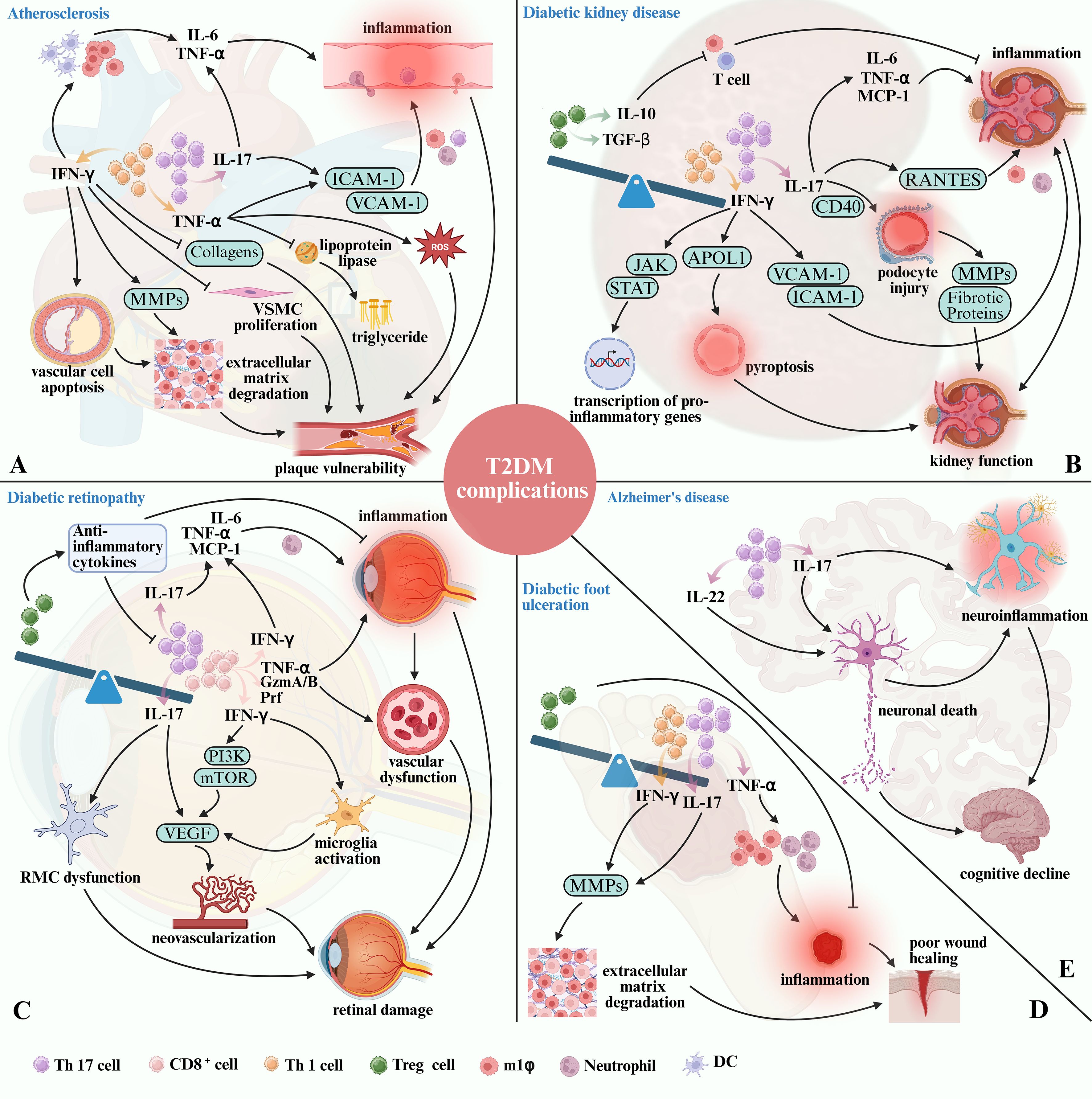 Figure 3. The role of T cell subset imbalance in T2DM-related complications. (A) IFN-γ secreted by Th1 cells promotes the development of AS and the instability of atherosclerotic plaque by causing inflammation, degradation of extracellular matrix, and inhibiting the proliferation of VSMC and collagens expression. At the same time, TNF-α secreted by Th1 cells causes inflammation, increases ROS and accumulates triglyceride, eventually aggravate AS. Th17 cells contribute to plaque vulnerability by enhancing pro-inflammatory cytokine production, and upregulating adhesion molecules via IL-17. (B) Elevated Th1 and Th17 activity contributes to persistent renal inflammation, immune cell infiltration, and direct cellular injury. In contrast, Tregs deficiency impairs immune regulation, thereby exacerbating chronic kidney damage and fibrosis. (C) Th17 cells promote retinal inflammation and pathological neovascularization through IL-17 production, while CD8+ T cells aggravate vascular permeability and retinal injury by secreting IFN-γ and TNF-α. Conversely, the reduction of Tregs aggravates inflammation and inhibits tissue repair. (D) Th1 and Th17 cells increase MMPs activity and stimulate the infiltration of neutrophils and pro-inflammatory M1 macrophages via TNF-α secretion, thereby contributing to delayed wound healing and the progression of DFU. While the decrease of Tregs boosts the occurrence of inflammation. (E) Th17 cells may exacerbate neuroinflammation and neuronal damage in T2DM through the secretion of IL-17 and IL-22, potentially increasing the risk of AD in diabetic individuals.