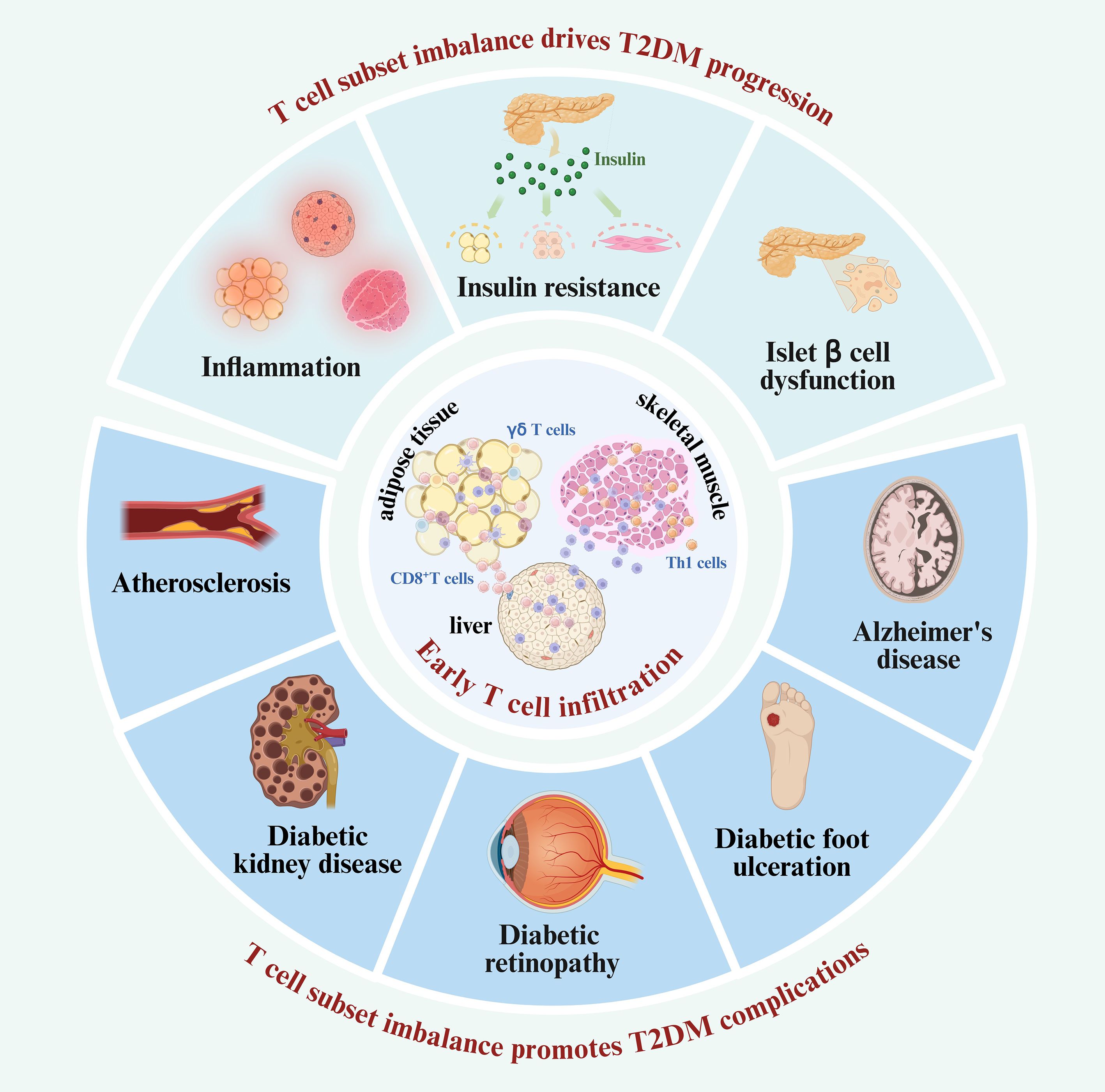 In this review, we examine the pivotal role of T cell subset imbalance in the pathological processes of T2DM and its associated complications. T cells are among the first immune cells to infiltrate insulin-responsive tissues. Then, an increase in pro-inflammatory subsets including CD8+ T cells, Th1, Th17, and Th22 cells, alongside a reduction in anti-inflammatory subsets such as Tregs,Th2 cells and γδT cells, leads to an imbalance which initiates inflammation. This imbalance of T cell subsets promotes the recruitment and polarization of M1 macrophages and elevates pro-inflammatory cytokine production, thereby inducing insulin resistance, advancing the progression of T2DM.Additionally, T cell subset imbalance contributes to islet inflammation and β-cell dysfunction. These findings support the new notion that the imbalance of T cell subsets is a central driver of T2DM progression and offer valuable insights into disease pathogenesis. As T2DM progresses, T cells exhibit a pro-inflammatory shift even in non–insulin-sensitive tissues, such as cardiovascular system, kidneys, retina, brain, and peripheral tissues. The imbalance in T cell subsets promotes the occurrence and development of T2DM complications primarily by inducing tissue inflammation, contributing to conditions such as AS, DKD, DR, AD, and DFU (Figure 4). Given the involvement of T cell subsets in T2DM and its complications, this review also discusses immunotherapeutic strategies that target T cell dysregulation—including restoring T cell subset balance, modulating pro- and anti-inflammatory cytokines derived from T cells, and altering macrophage polarization induced by pro-inflammatory T cells. Although this review underscores the critical role of T cell subset imbalance in the pathogenesis and treatment of T2DM and its complications, the specific reasons and network mechanisms driving this imbalance remain elusive. Furthermore, T2DM immunotherapy still faces certain clinical application limitations and potential safety risks, necessitating further clinical exploration.