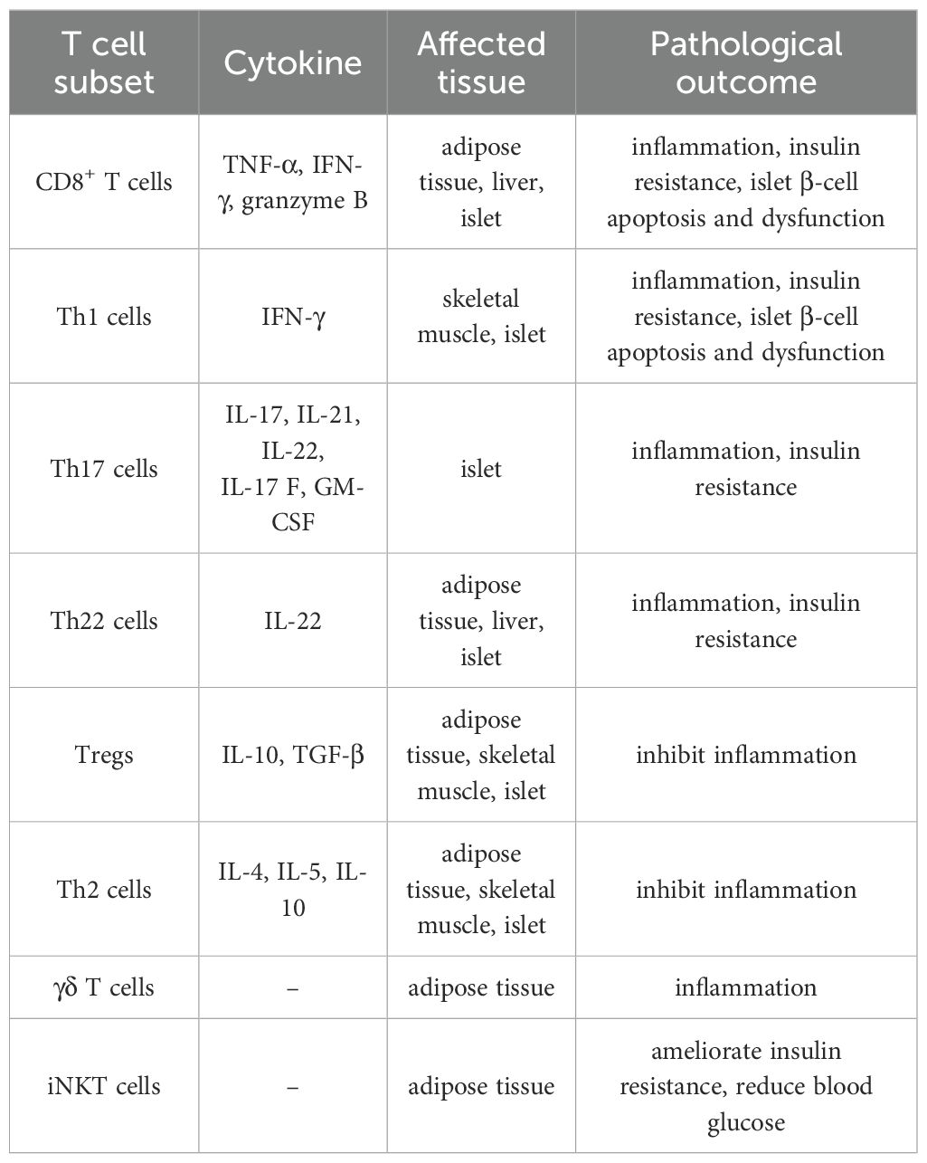 Th22 cells, which produce IL-22, have a more nuanced role in T2DM-associated inflammation. Elevated levels of Th22 cells and IL-22 have been observed in individuals with obesity and T2DM. This elevation is more pronounced than that of other pro-inflammatory subsets, such as Th1 and Th17 cells (51). IL-22 can amplify IL-1β-driven inflammation in human adipose tissue (52). In addition, IL-22 has been implicated in hepatic inflammation, which is commonly associated with insulin resistance and non-alcoholic fatty liver disease (NAFLD)—conditions that frequently co-occur with T2DM (53).