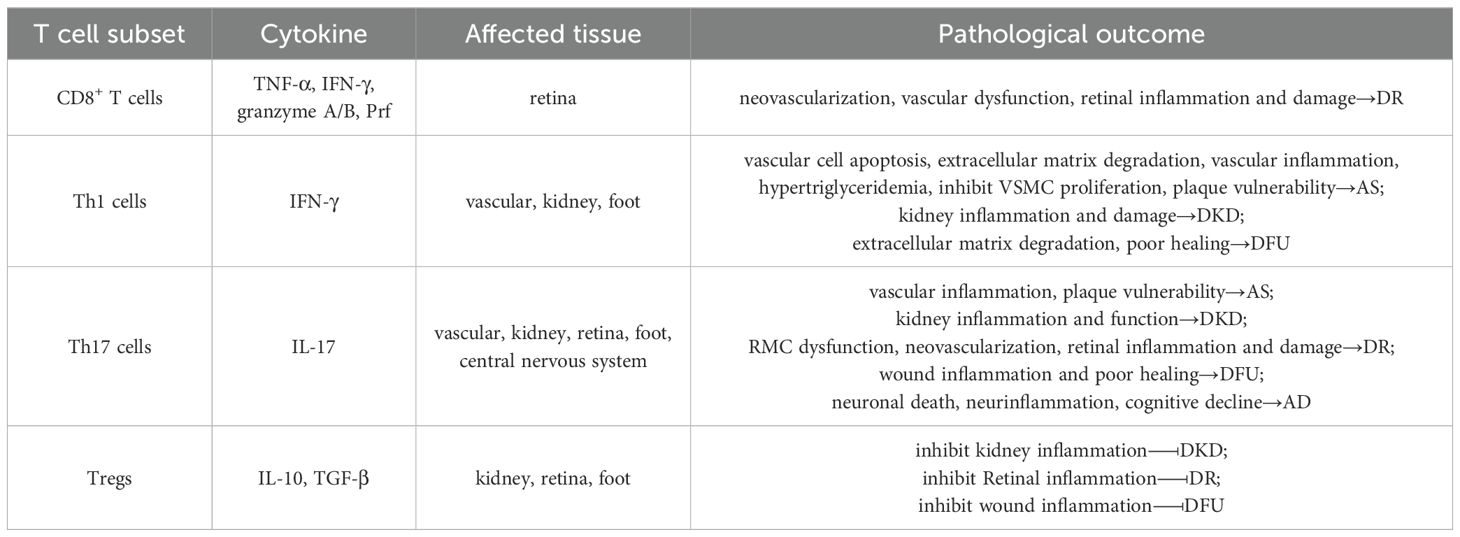 In the advanced stages of T2DM, chronic hyperglycemia, insulin resistance, and systemic inflammation drive the development of severe complications such as AS, DKD, and DR. Increasing evidence indicates that T cell subset imbalance and tissue infiltration—particularly by Th1, Th17, CD8+ T cells, and Tregs, play critical roles in the progression of these complications. Understanding the roles of T cell subsets in these diabetic complications is crucial for developing targeted therapies aimed at modulating immune responses to prevent or mitigate disease progression (Table 2).