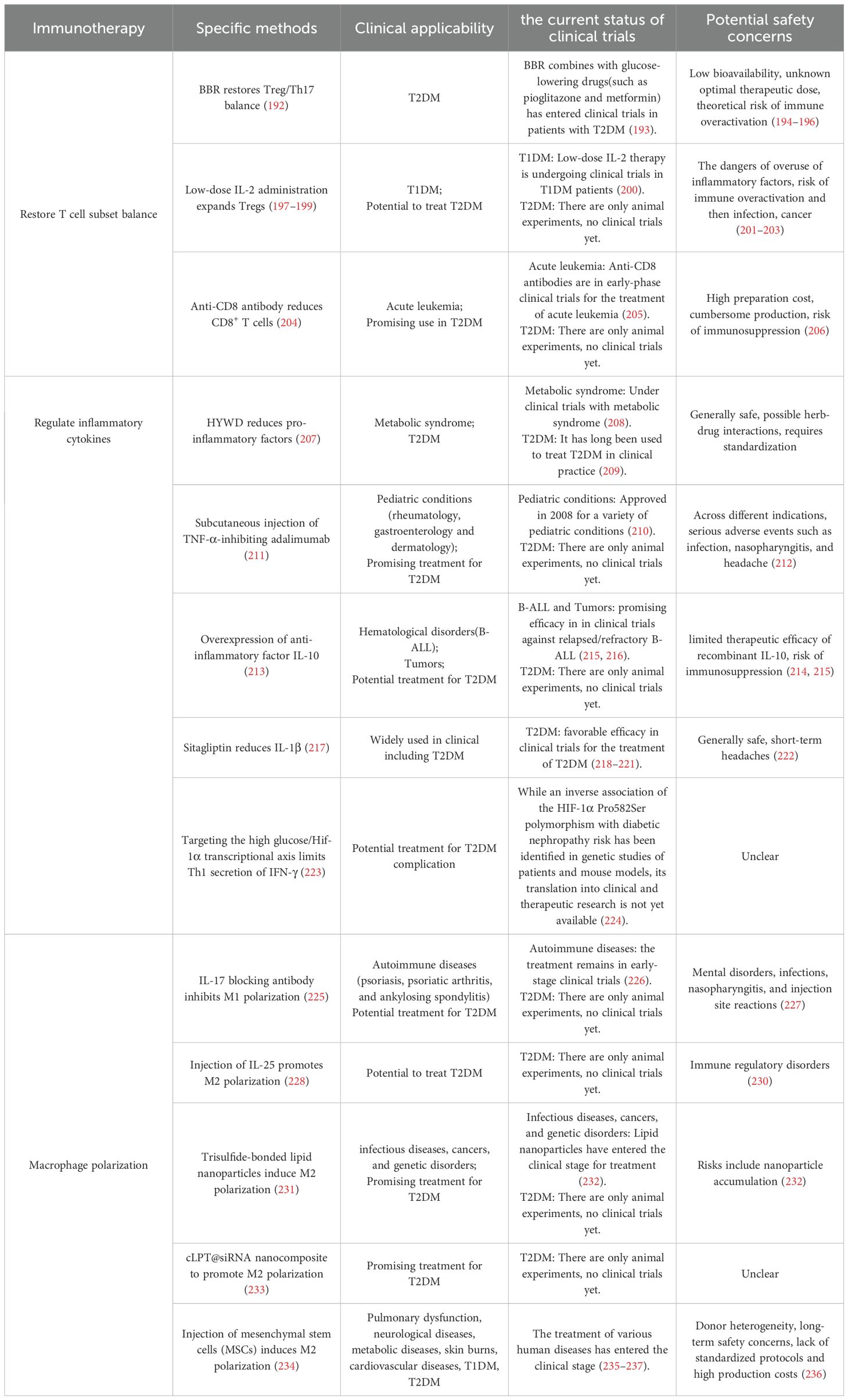 All the above studies demonstrate that a promising therapeutic strategy for T2DM and its complications involves correcting T cell subset imbalance, regulating inflammatory cytokines, and altering macrophage polarization. Nevertheless, the translation of some strategies to the clinic is hindered by limited applicability and potential safety concerns (Table 3). Importantly, lifestyle modification continues to be the foundation of diabetes management (238). In the future, combining healthy lifestyle interventions with conventional treatments and innovative immunotherapies may pave the way for more effective diabetes management.