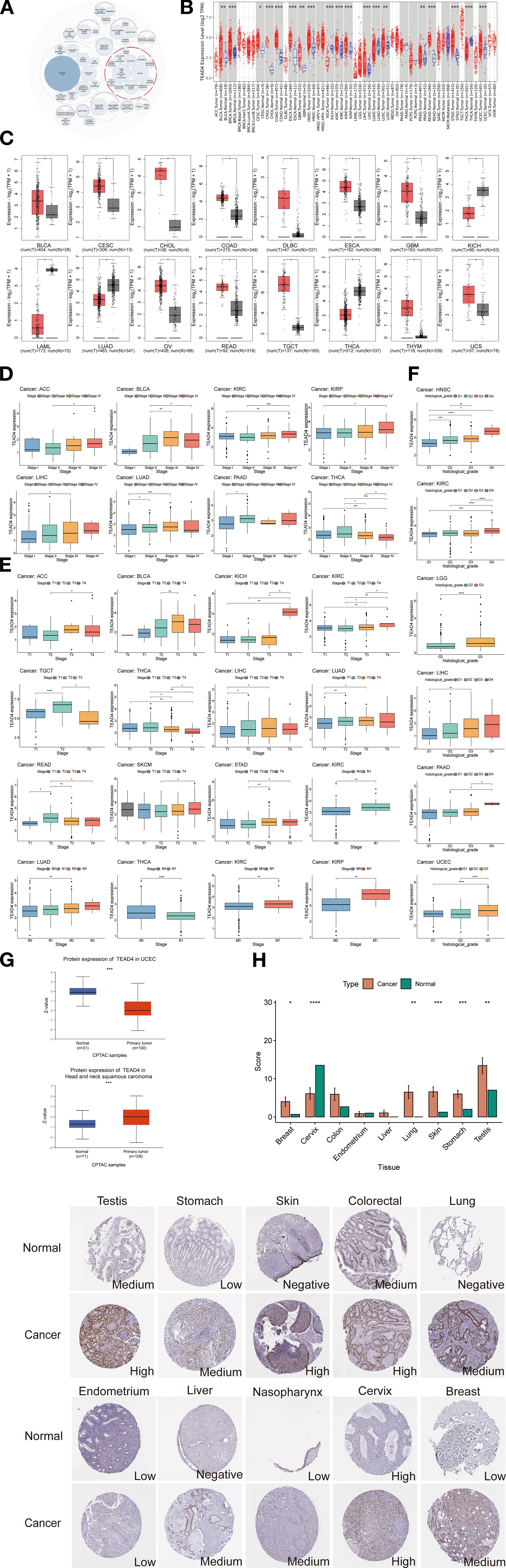 Figure 1. TEAD4 functional profiling and expression analysis. (A) Open Targets platform revealed significant associations between TEAD4 and multiple diseases, where the circle sizes represent the strength of association scores. (B) TIMER 2.0 database revealed significant differential expression of TEAD4 between tumor tissues and adjacent normal tissues. Tumors and adjacent tissues are colored in red and blue, respectively. (C) Boxplots represent the differential expression of TEAD4 mRNA log2 expression levels between tumors and normal tissues in 16 cancer types via GEPIA2.0. (D) Differential TEAD4 expression across cancer stages. (E) Differential TEAD4 expression across cancer TNM stages. (F) Differential TEAD4 expression across tumor grades. (G) UALCAN database reveals differential TEAD4 protein expression between tumor and normal tissues. (H) HPA database documents TEAD4 protein distribution patterns and expression intensity (quantified by immunohistochemical staining scores) in malignant versus normal tissues (*P < 0.05, **P < 0.01, ***P < 0.001, ****P < 0.0001).