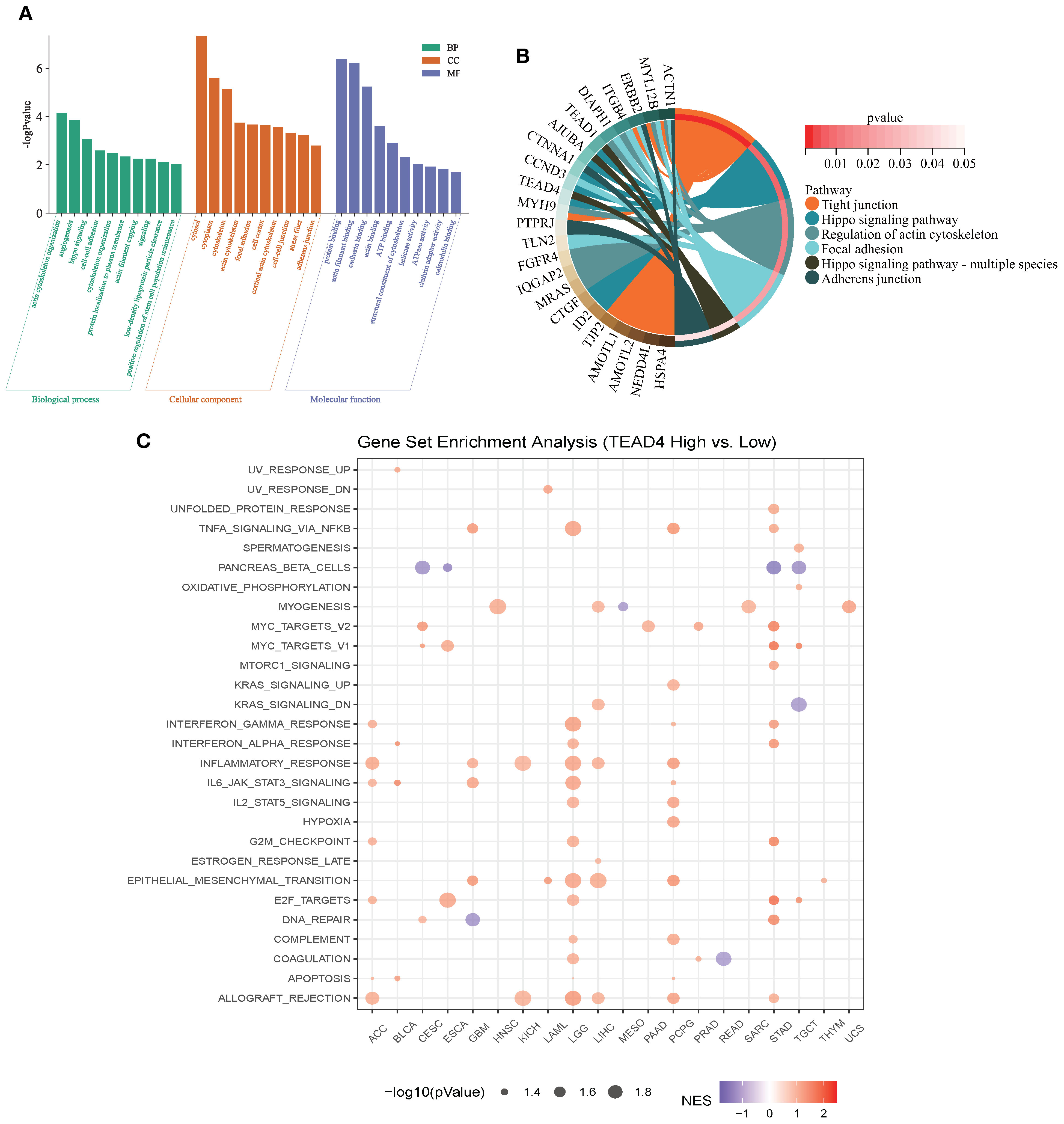 Gene Set Enrichment Analysis (GSEA) was performed using the clusterProfiler R package (version 4.8.3) (27). Tumor samples were stratified into high-TEAD4 and low-TEAD4 expression groups based on median expression values. Genes were ranked according to their differential expression between these two groups. Enrichment analysis was subsequently conducted against reference gene sets from the Molecular Signatures Database (MSigDB, version 7.4 and v2024.1.Hs), including h.all.v7.4.symbols.gmt (Hallmark gene sets), c2.all.v2024.1.Hs.symbols.gmt (Curated gene sets, encompassing KEGG, Reactome, BioCarta), and c5.all.v2024.1.Hs.symbols.gmt (GO gene sets). Results with a P-value < 0.05 were considered statistically significant and were visualized using bubble plots and ridge plots.