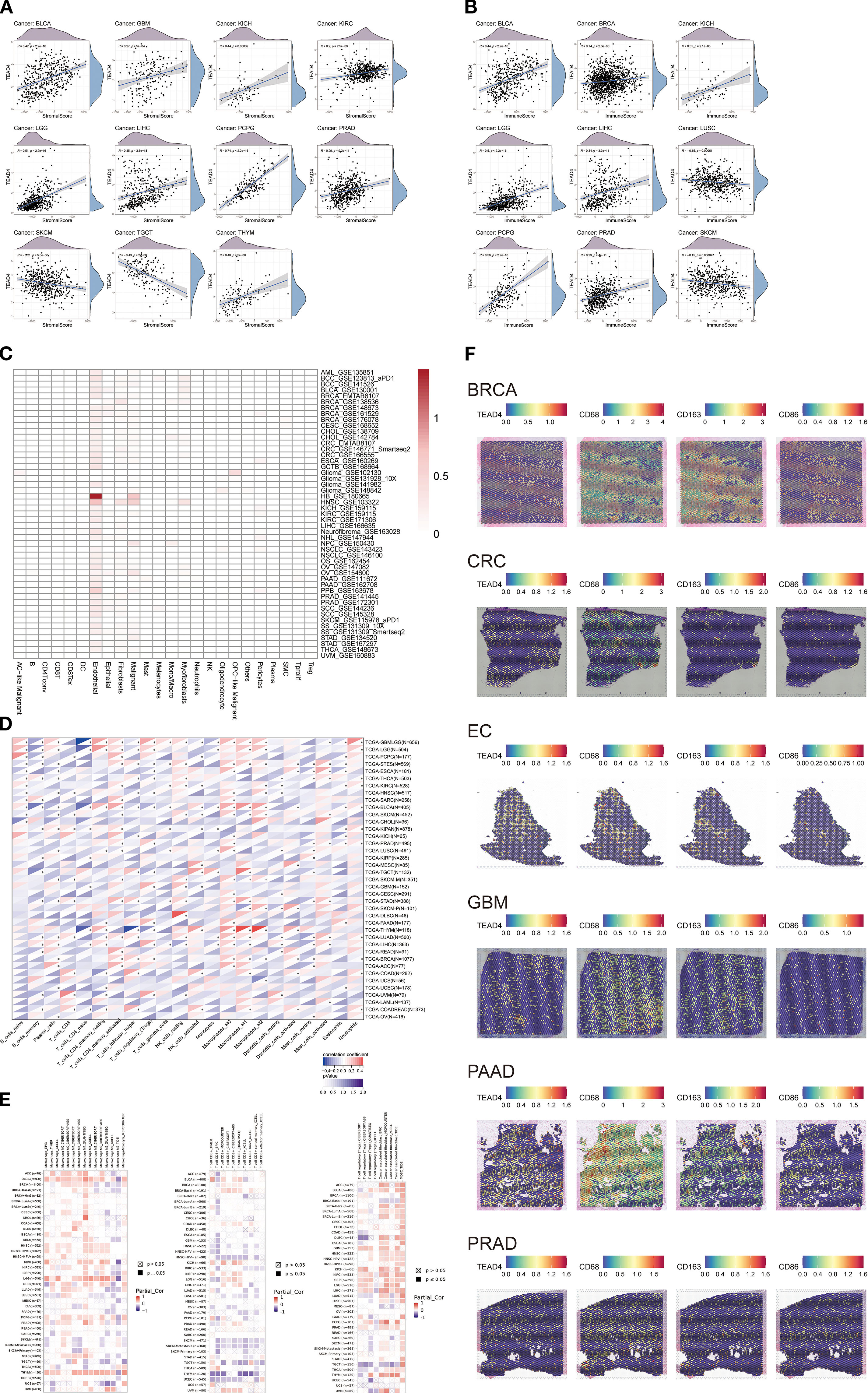 Spatial transcriptomic profiles for CRC and PRAD were obtained from datasets generated using the 10x Genomics Visium platform. Additionally, spatial transcriptomic datasets for other malignancies, including BRCA, UCEC, PAAD, and GBM, were retrieved from GEO under accession numbers GSE243275, GSE225690, GSE194329, and GSE235315, respectively. These datasets are listed in Supplementary Table 2. This integrated spatial omics resource facilitated the systematic evaluation of TEAD4 expression patterns in relation to the spatial distribution of immune cells within TME.