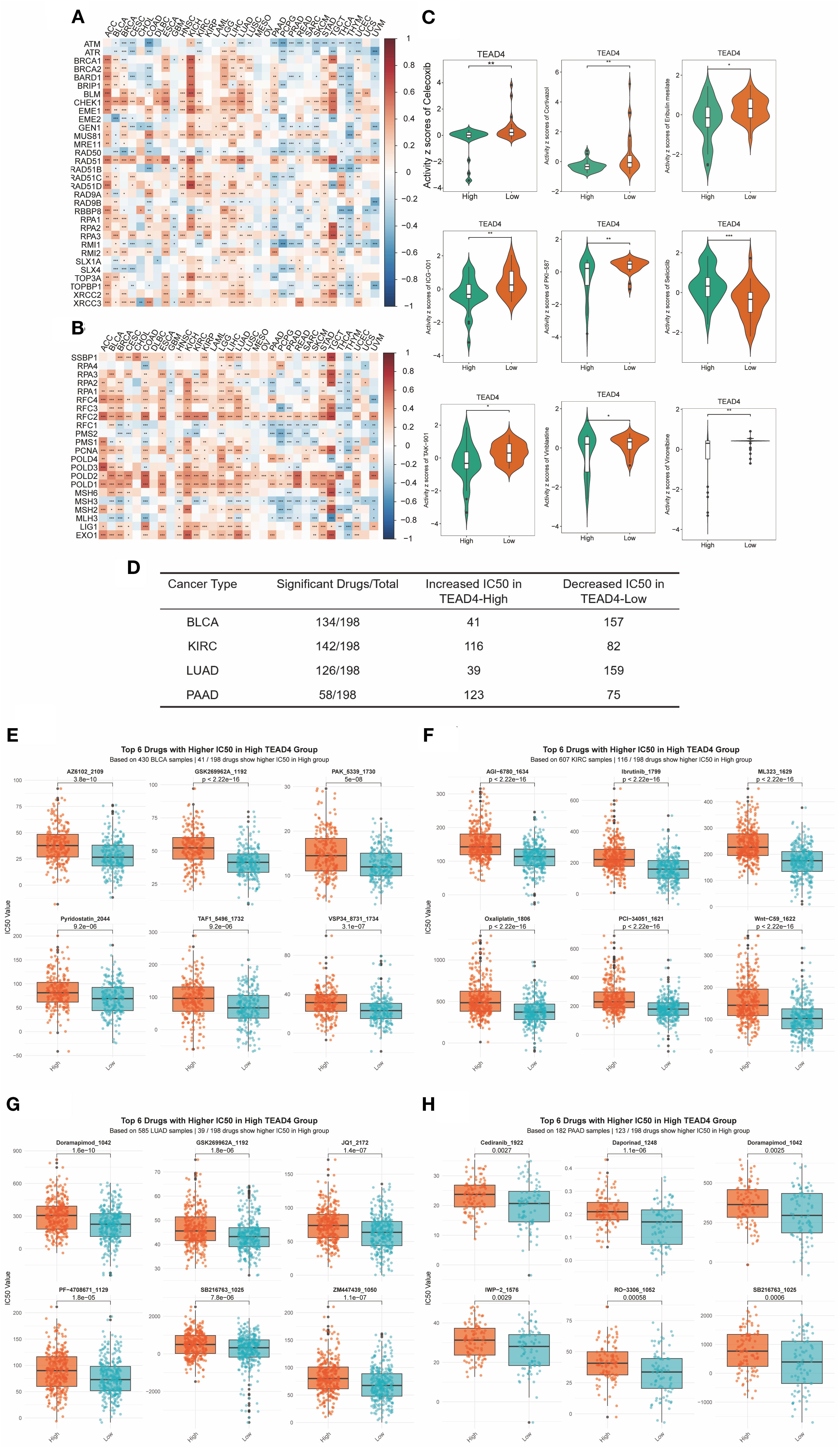 The Genomics of Drug Sensitivity in Cancer (GDSC) (https://www.cancerrxgene.org/) is currently the largest public database on drug sensitivity in cancer cell lines. To investigate the relationship between gene expression and drug sensitivity, it is necessary to obtain gene expression profiles across different cell lines, as well as IC50 or AUC values of various drugs for each cell line. This study uses the GDSC2 database as the training set, in which GDSC2_exp is a standardized expression matrix comprising 17,419 genes and 805 cell lines, while GDSC_drug provides IC50 values of 198 drugs across the 805 cell lines. A predictive model was built based on this training set and then applied to expression data from BLCA, KIRC, LUAD, and PAAD samples in the GDC TCGA, which were downloaded from the UCSC Xena website. Finally, the difference in IC50 values between high and low TEAD4 expression groups was compared, and its statistical significance was evaluated.