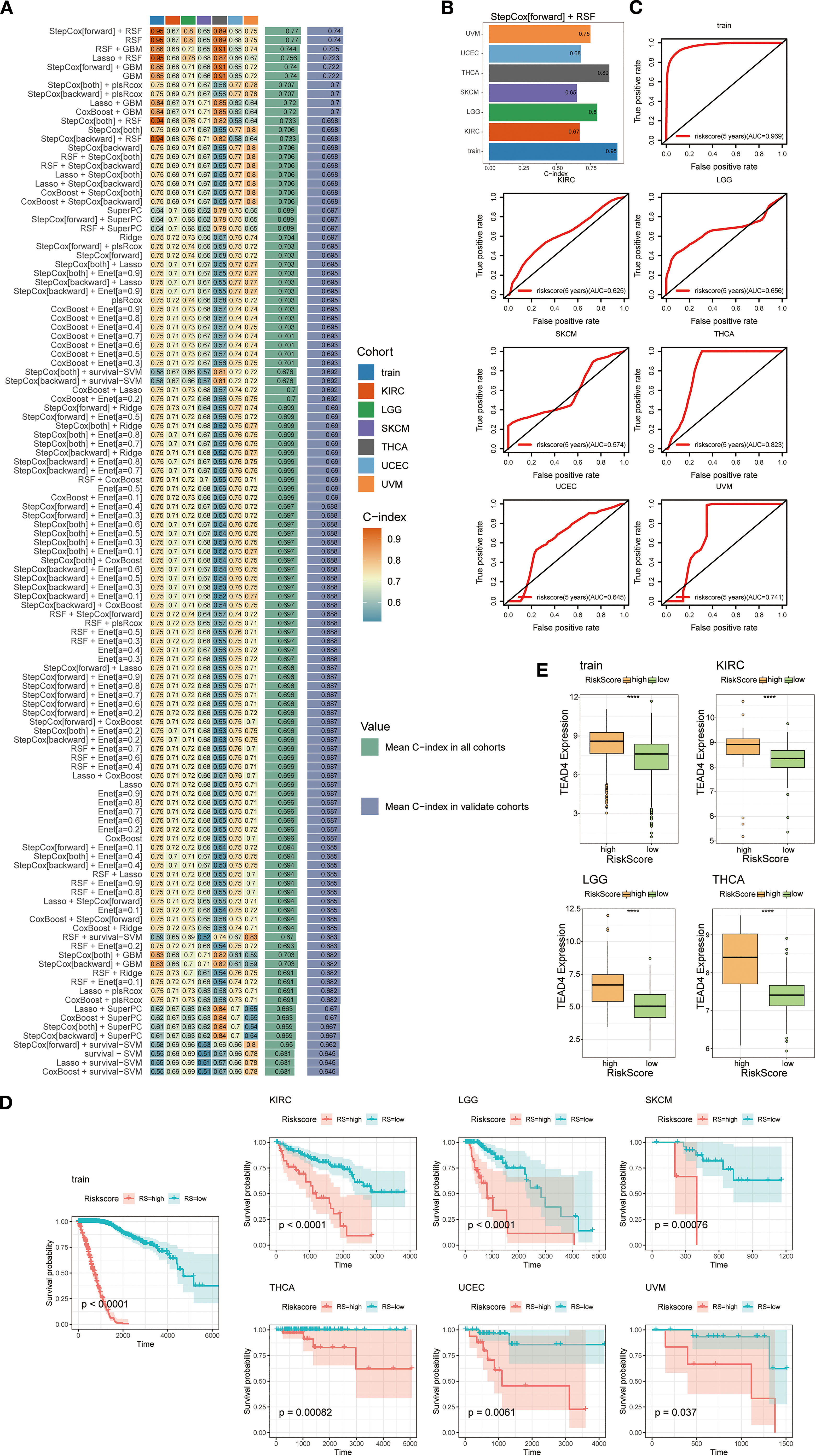 In the data preprocessing phase, samples from each selected cancer type were randomly divided into a training set (70% of samples) and a test set (30% of samples). Within the training set, univariate Cox regression analysis was performed to identify prognostically significant TEAD4 target genes. Subsequently, a multivariate Cox proportional hazards model was constructed using a stepwise backward elimination approach based on the Akaike Information Criterion (AIC) to select the optimal combination of genes for the prognostic signature. The risk score for each patient was calculated as a linear combination of the expression levels of the selected genes, weighted by their respective Cox regression coefficients. Patients were then stratified into high-risk and low-risk groups based on the median risk score. The prognostic performance of the model was evaluated in both the training and test sets using Kaplan-Meier survival analysis (log-rank test) and time-dependent Receiver Operating Characteristic (ROC) curve analysis (AUC values for 1-, 3-, and 5-year survival).