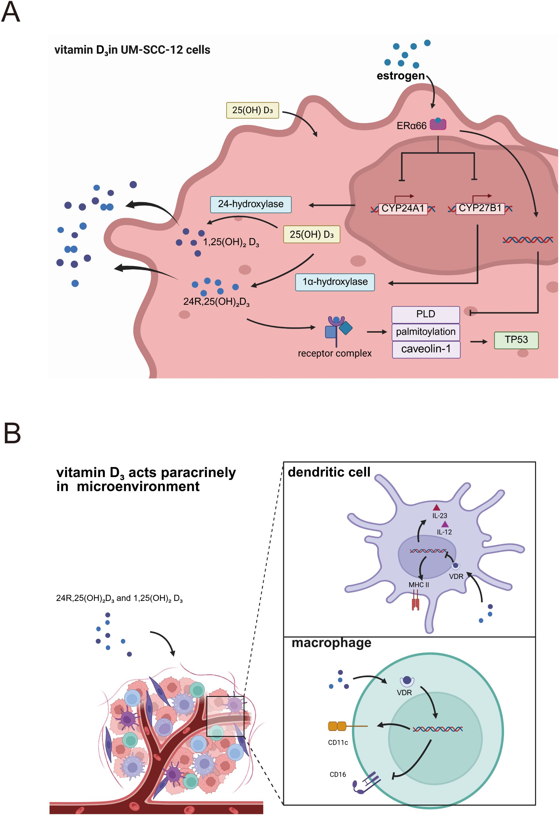 Figure 2. (A) Mechanisms of vitamin D3 action in laryngeal cancer cells expressing estrogen receptors. (B) Paracrine vitamin D3 shapes immune cells within the laryngeal-cancer immune microenvironment.
