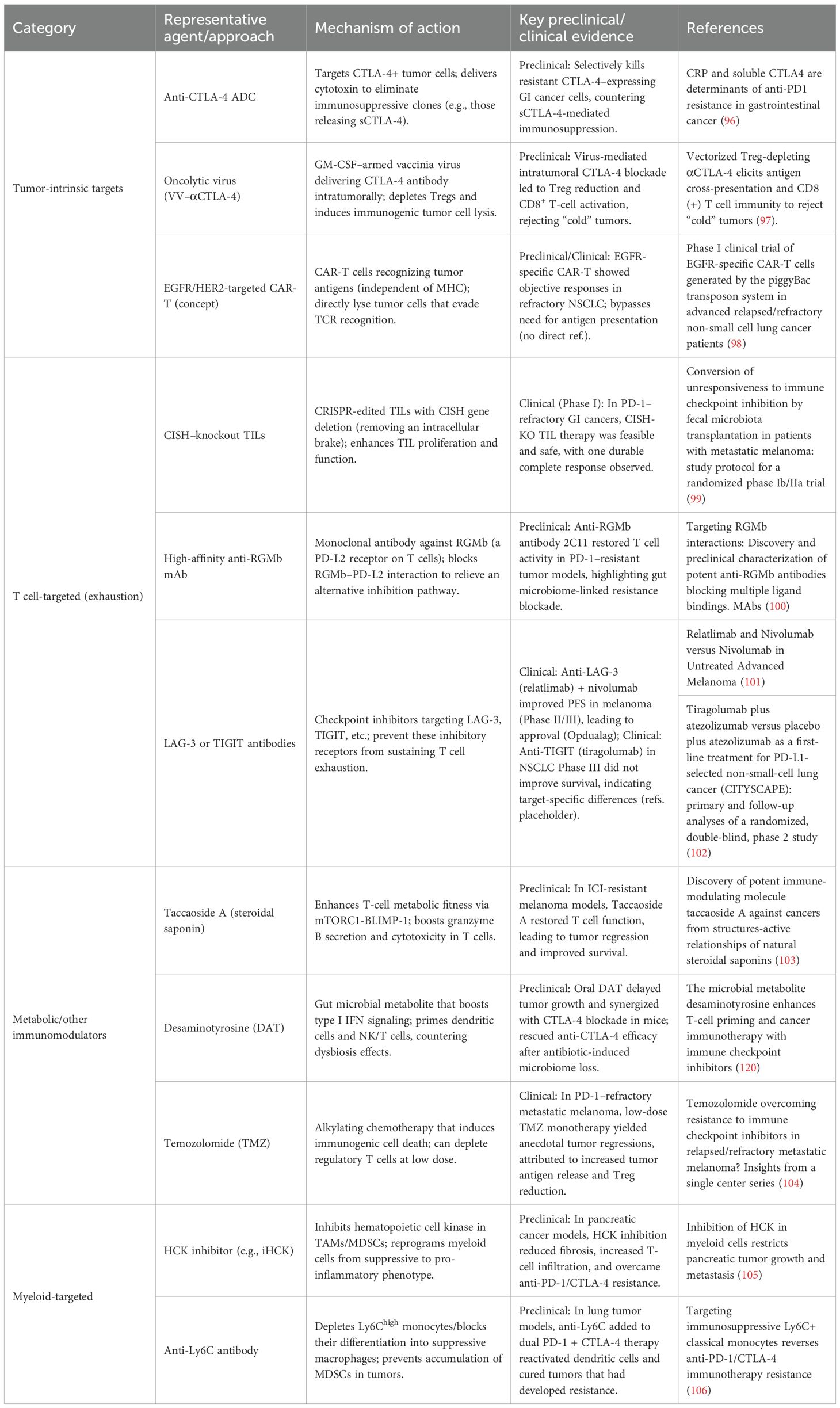 Resistance to PD-1/PD-L1 and CTLA-4 blockade can be countered by tailoring therapies to the underlying mechanism of immune evasion. Rather than classifying approaches as monotherapies or combinations, current strategies are best organized by the resistance mechanisms they target. Below, we discuss interventions aimed at (1) tumor-intrinsic resistance (e.g., impaired antigen presentation, oncogenic immune evasion) (2), immune cell dysfunction (e.g., T cell exhaustion, alternative checkpoints), and (3) the immunosuppressive tumor microenvironment (e.g., myeloid cells, metabolites, stroma). Table 1 summarizes key mechanism-targeted monotherapies, and Table 2 outlines rational combination regimens designed to overcome resistance.
