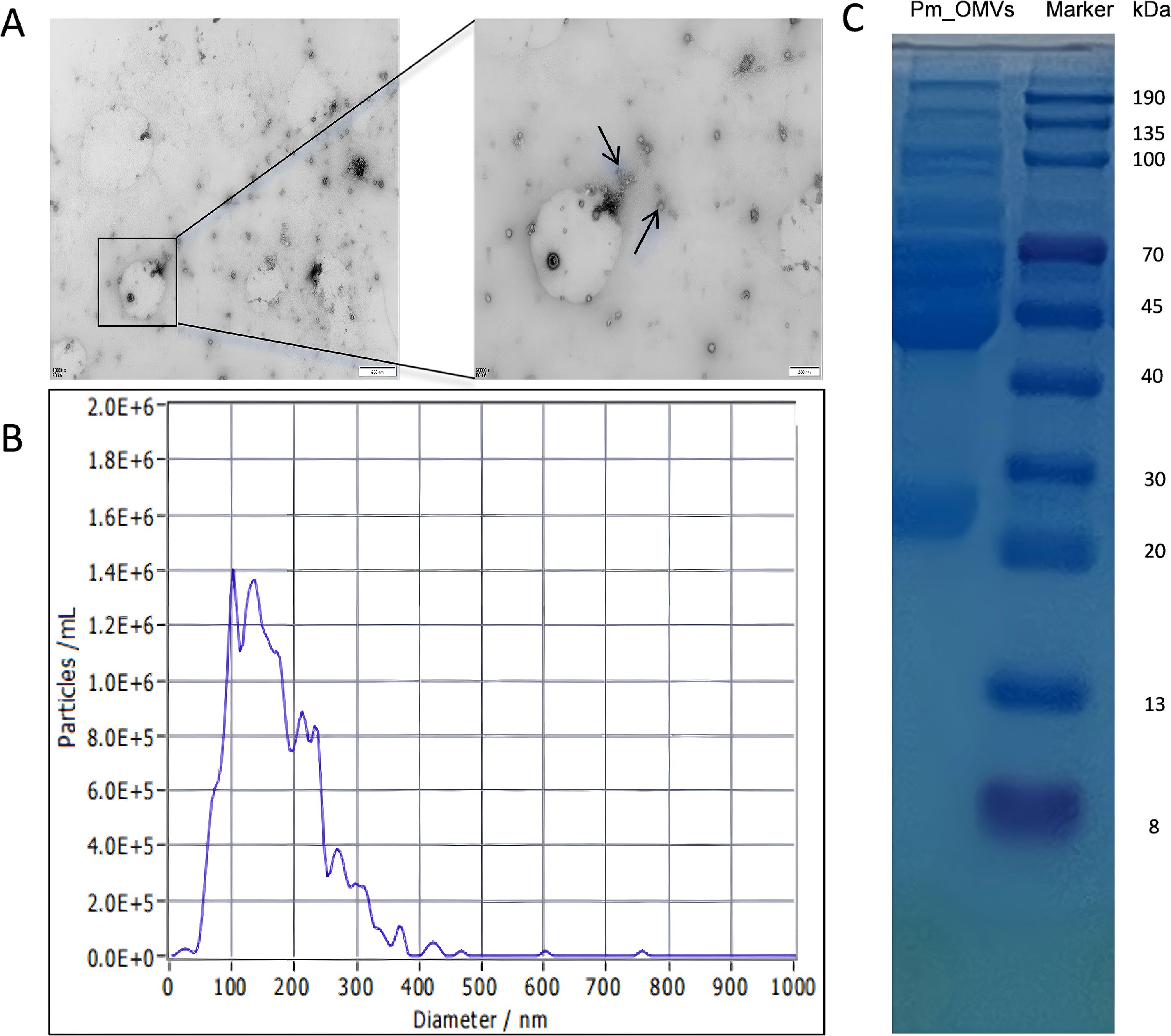 Figure 1. Characterization of outer membrane vesicles of Proteus mirabilis. (A) Electron microscopic observation of Pm_OMVs at 200 and 500 nm, respectively. (B) Particle size distribution of Pm_OMVs in the bacterial culture solution. (C) Results of Coomassie blue staining of Pm_OMVs.