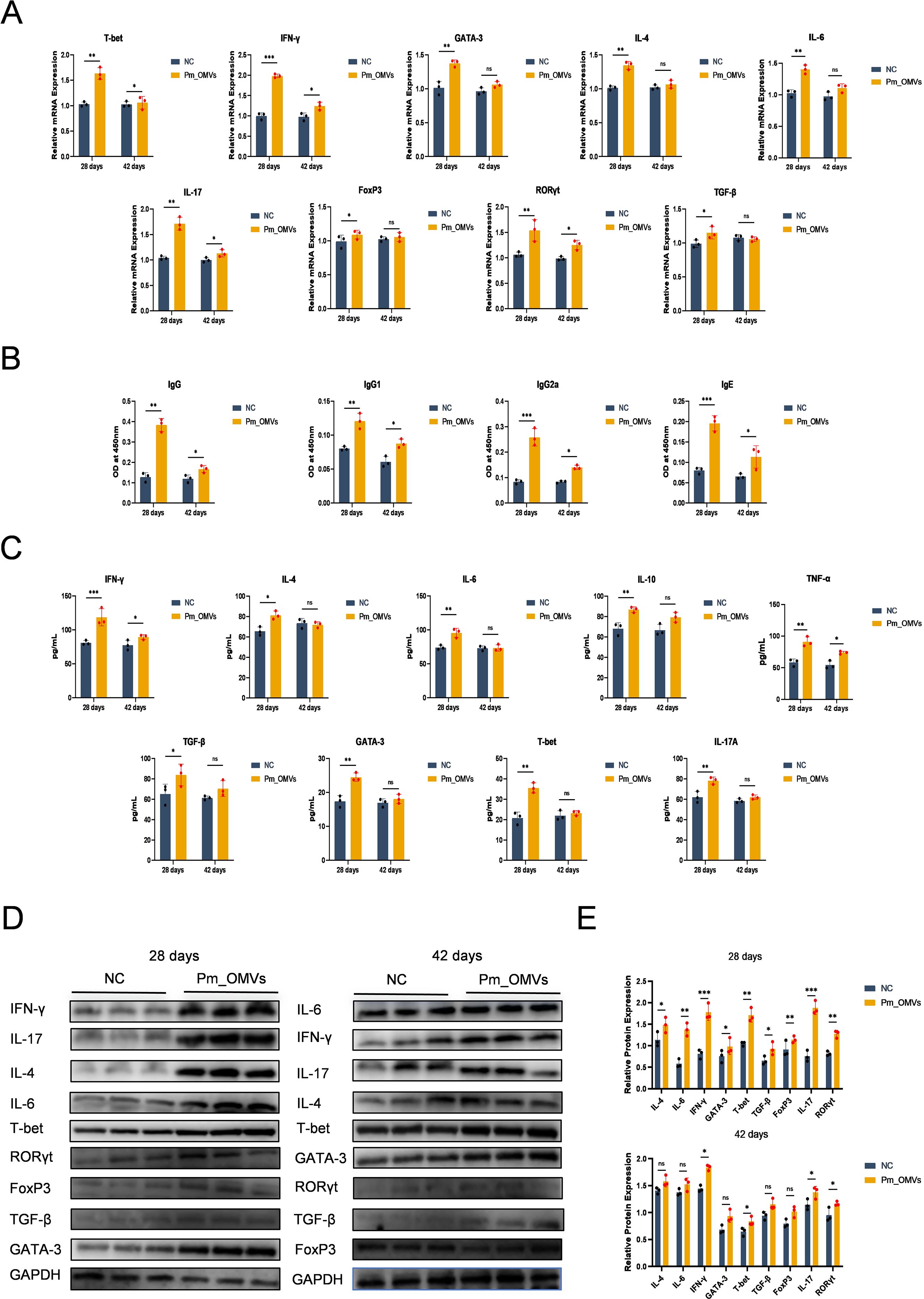 Figure 3. Effects of Pm_OMVs on Th cell differentiation in mice (A) Effects of Pm_OMVs on IFN-γ, IL-4, IL-6, IL-17, TGF-β, GATA-3, T-bet, RORγt, and FoxP3 mRNA expression levels in immunised mice (n=3). (B) Effect of Pm_OMVs on the secretion levels of specific antibodies IgG, IgG1, IgG2a, and IgGE in immunised mice (n=3). (C) Effects of Pm_OMVs on the secretion levels of cytokines IFN-γ, IL-4, IL-6, IL-17A, TGF-β, GATA-3, T-bet, and IL-10 in immunised mice (n=3). (D, E) Effects of Pm_OMVs on protein expression levels of IFN-γ, IL-4, IL-6, IL-17, TGF-β, GATA-3, T-bet, RORγt, and FoxP3 in immunised mice (n=3). ***P<0.001, **P<0.01, *P<0.05 refer to the level of significance and ns denotes no significance.