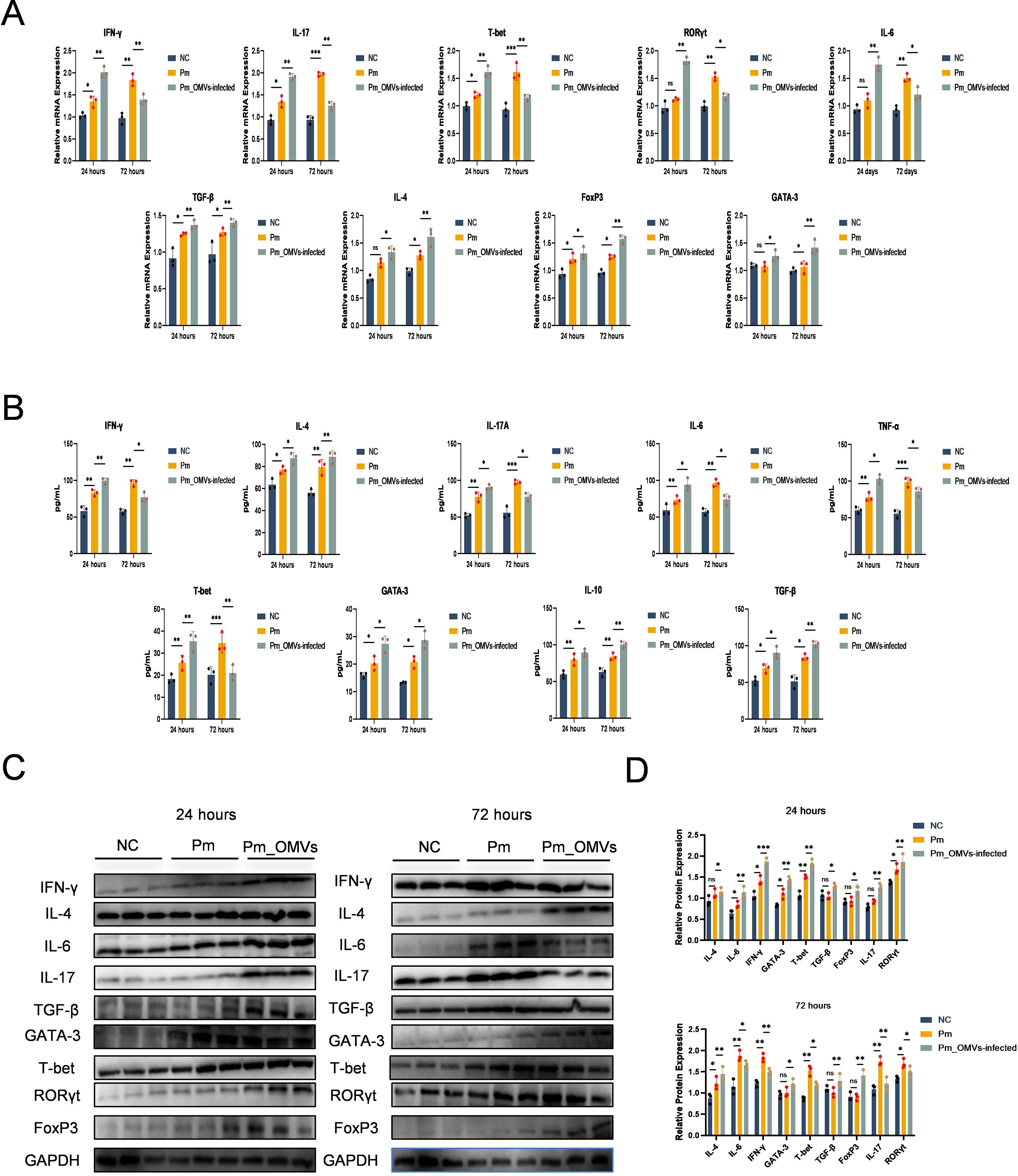Figure 4. Pm_OMVs induces Th cell polarisation to protect Pm-infected mice. (A) Changes in the expression levels of IFN-γ, IL-4, IL-6, IL-17, TGF-β, GATA-3, T-bet, RORγt, and FoxP3 mRNA in each group (n=3). (B) Changes in the secretion levels of cytokines IFN-γ, IL-4, IL-6, IL-17A, TGF-β, GATA-3, T-bet, IL-10, and TNF-a in each group (n=3). (C, D) Changes in protein expression levels of IFN-γ, IL-4, IL-6, IL-17, TGF-β, GATA-3, T-bet, RORγt, and FoxP3 in each group (n=3). ***P<0.001, **P<0.01, *P<0.05 refer to the level of significance and ns denotes no significance.