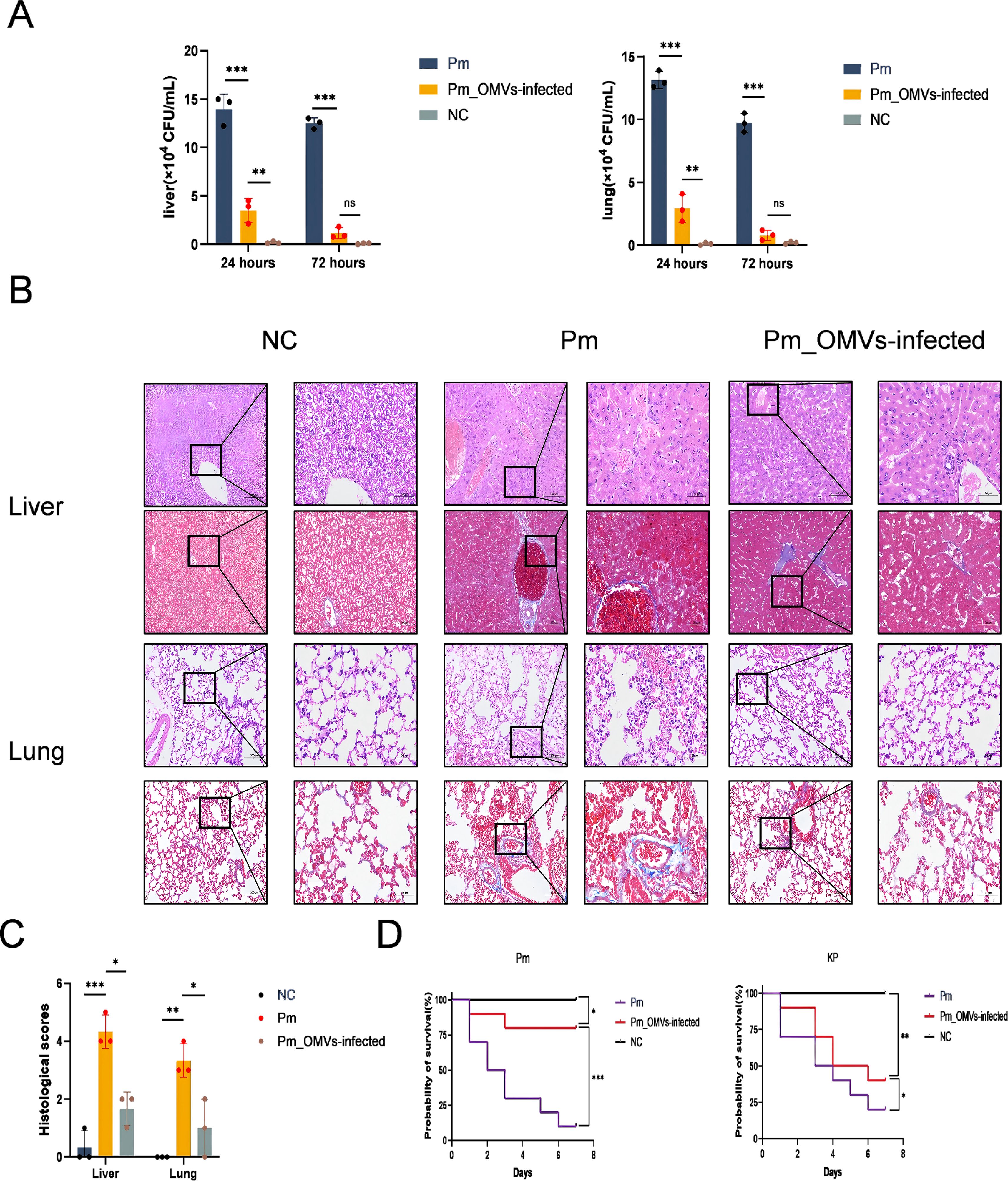 Figure 5. Immunoprotection of Pm_OMVs against Pm-infected mice. (A) Bacterial load of Pm group and Pm_OMVs-infected group after 24 and 72h of Pm infection (n-3). (B) HE and Masson staining results of liver and lung of each group (200×, 400×). (C) Histological scores of liver and lung pathology in NC group, Pm group, and Pm_OMVs group (n=3). (D) Survival curves of each group at 7 d after Pm, KP infection (n=10). ***P<0.001, **P<0.01, *P<0.05, refer to the level of significance and ns denotes no significance.
