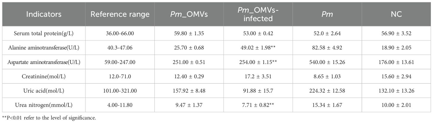 Table 1. Physiological and biochemical indicators tests in Control, Pm_OMVs, Pm, and Pm_OMVs-infected mice.