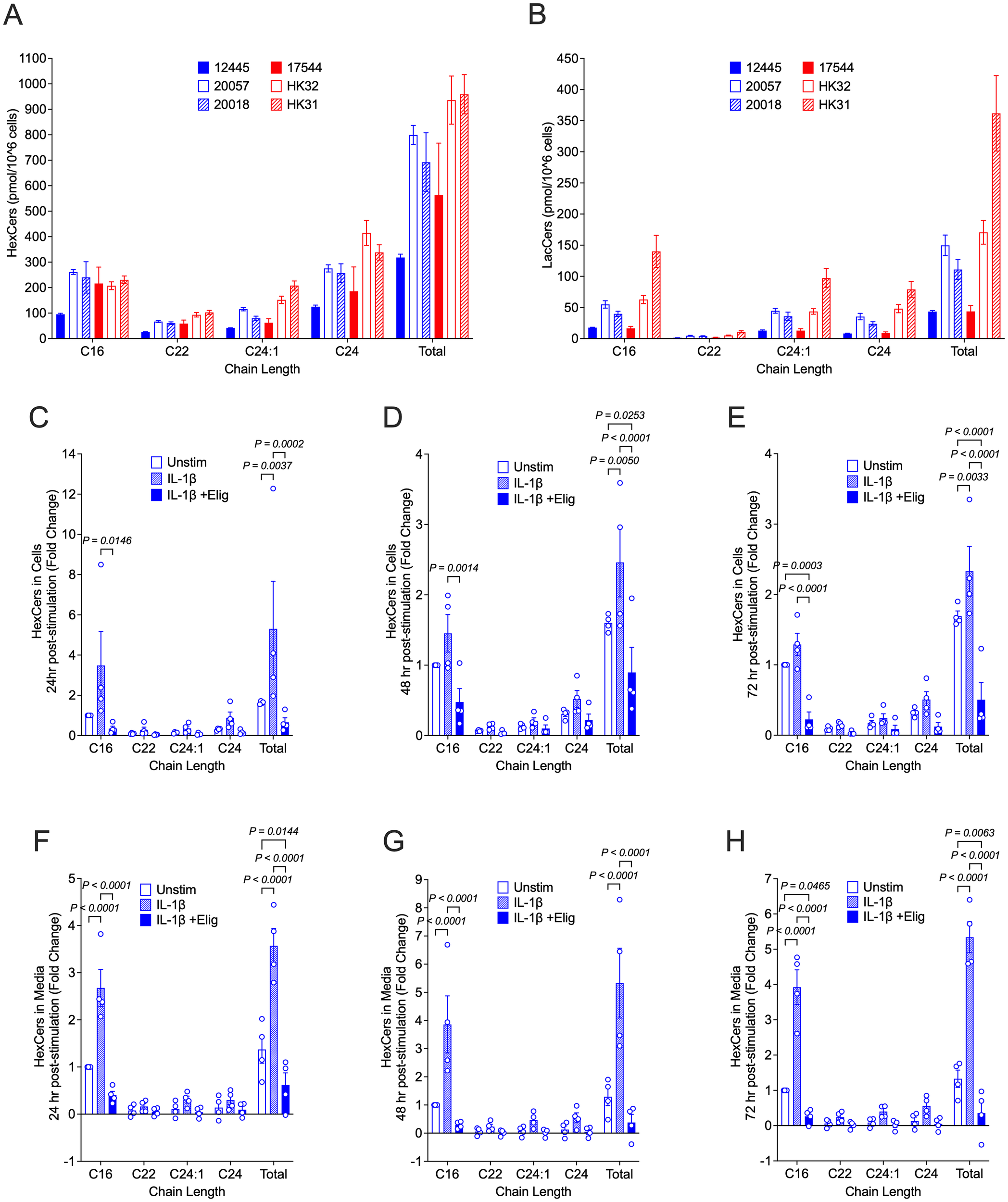 HexCers levels increase in response to IL-1β and reduced by eliglustat in hRMCs. For (A, B), all 6 lots of cells were grown to ~90% confluency in duplicate, trypsinized, counted, and HexCers (A) and LacCers (B) measured in 1x10^6 cells by high-performance liquid chromatography-tandem mass spectrometry (HPLC/MS/MS). Major chain lengths expressed in the cells are presented. Bars are mean +SD of duplicate wells. For (C–H), hRMCs lots 17544, 12445, 20057, and 20018 were treated in quadruplicate with vehicles, IL-1β, or IL-1β +20 nM eliglustat for 24h (C, F), 48h (D, G), or 72h (E, H). Media was collected, cell viability measured by the alamar blue assay, and cells collected. Quadruplicates within each experiment were pooled and HexCers in cells (C–E) and media (F–H) measured as in (A, B). HexCers measured in the culture media alone (was not incubated with cells) was subtracted from the media levels in (F–H). Levels were then normalized to cell viability and fold change calculated setting vehicle-treated to 1 for each experiment (hRMC lot). Fold change for the three lots were averaged and mean +SD presented. P-values were determined by two-way ANOVA with Tukey’s multiple comparisons test.