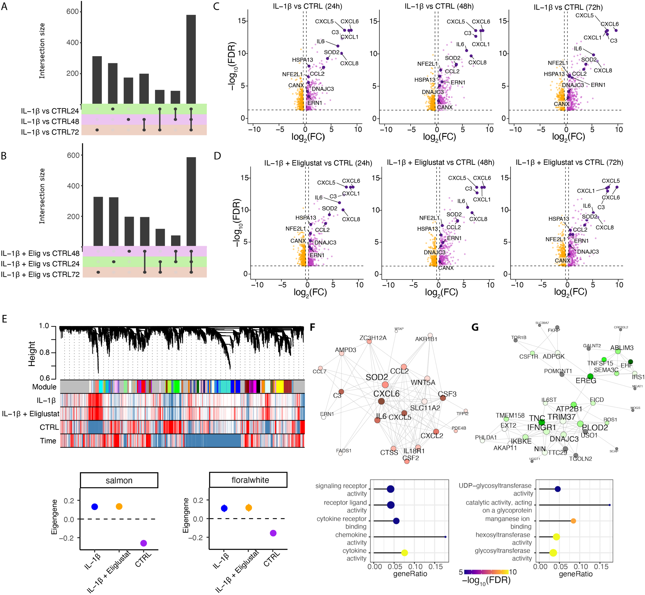 IL-1β upregulates expression of genes in ER stress pathways in hRMCs. hRMCs lots 20018, 12445, and 17544 were treated with vehicle, 25 ng/ml IL-1β, or 25 ng/ml IL-1β +20 nM eliglustat for 24h, 48h, or 72h in quadruplicate and RNA sequencing performed. (A–B) UpSet plots showing shared and unique differentially expressed genes between IL-1β and untreated (A), and IL-1β +eliglustat and untreated (B) samples across different time points. (C, D) Volcano plots displaying significantly upregulated (purple) and downregulated (orange) genes following IL-1β treatment (C) and IL-1β +eliglustat treatment (D). Highlighted genes are associated with immune response and ER functions. (E) Representative network dendrogram showing correlation patterns between detected co-expression modules, treatments, and time points, and below, dot plots with standard errors (SEs) illustrating the association of selected modules. SEs are calculated based on the module eigengenes across samples. Dots represent the mean eigengene expression for each module. (F, G) Network visualization of the top 200 connections ranked by weighted topological overlap for the salmon (F) and floralwhite (G) modules. Node size corresponds to the number of edges (degree). Enriched pathways for biological process are shown below each module. CTRL= vehicle-treated.