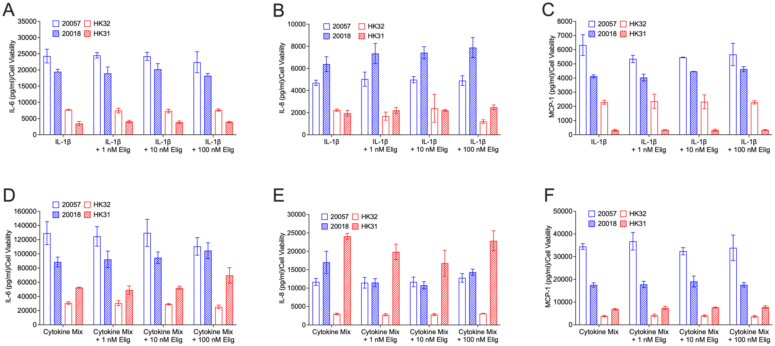 Eliglustat does not significantly impact IL-6, IL-8, MCP-1 release in response to IL-1β or cytokine mix at 24 hours post-treatment. hRMC lots 20057, 20018, HK31, and HK32 were treated with: (A–C) IL-1β, IL-1β plus 1 nM, 10 nM, or 100 nM eliglustat, or vehicles in triplicate; or (D–F) cytokine mix, cytokine mix plus 1 nM, 10 nM, or 100 nM eliglustat, or vehicles in triplicate. Media was collected after 24h, cell viability measured by alamar blue, and IL-6 (A, D), IL-8 (B, E), or MCP-1 (C, F) measured in the media by ELISA. Data is the mean of the triplicate wells +SD.