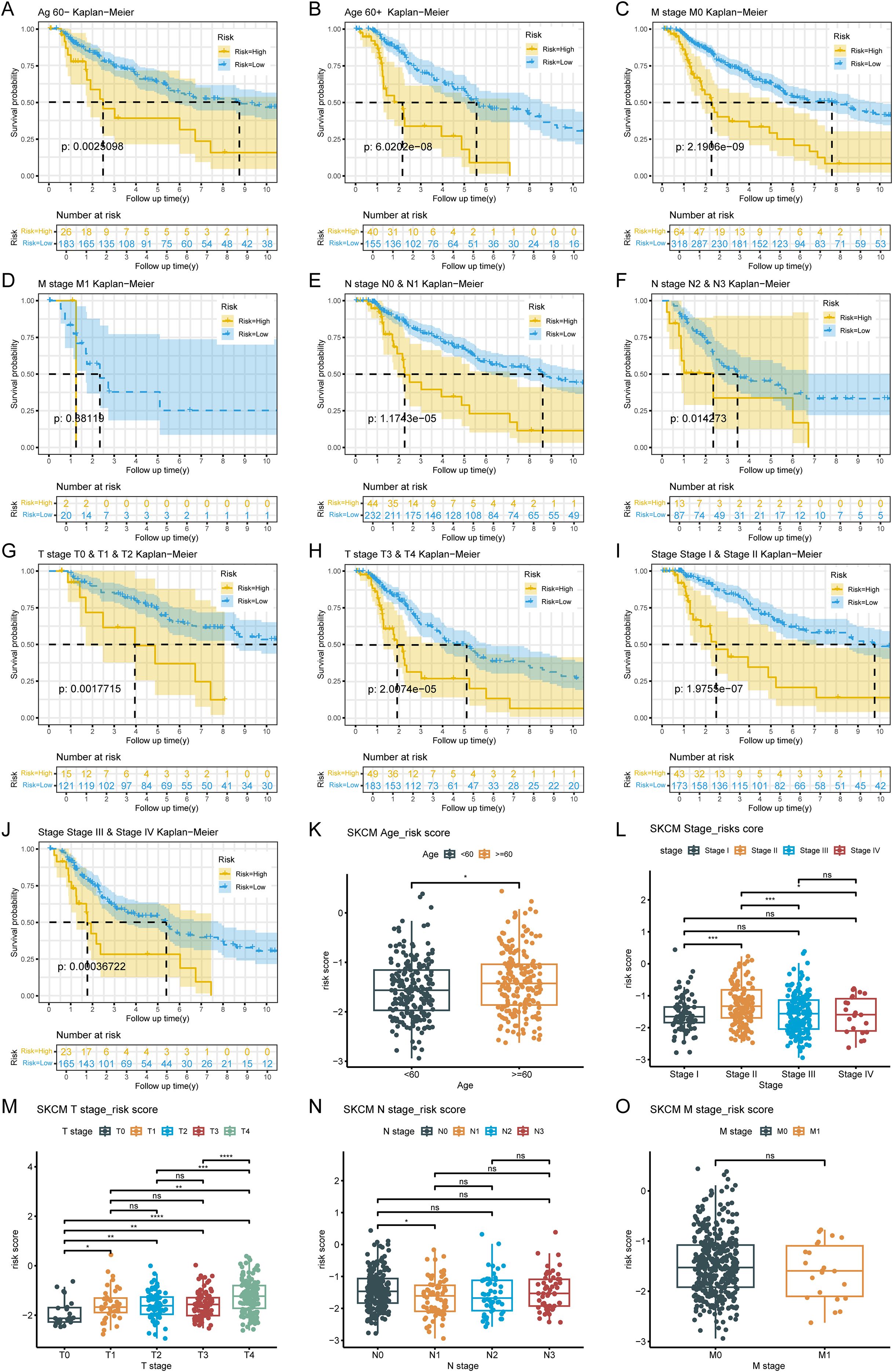 Figure 3. Analysis of the correlation between risk scores and clinical characteristics. (A-J) Survival analysis across clinical subgroups. The lower portion of each plot shows the number of patients at risk over time, while the upper portion displays the Kaplan-Meier survival curves. Each panel represents a different clinical subgroup: (A) Age < 60 years; (B) Age ≥ 60 years; (C) M0; (D) M1; (E) N0 & N1; (F) N2 & N3; (G) T0, T1 & T2; (H) T3 & T4; (I) Stage I & Stage II; (J) Stage III & Stage IV. (K-O) Boxplots of risk scores stratified by clinical features. The x-axis represents different clinical subgroups, and the y-axis shows the risk score. Statistical significance is indicated above each comparison: ns means not significant, * means p < 0.05, ** means p < 0.01, *** means p < 0.001, and **** means p < 0.0001.
