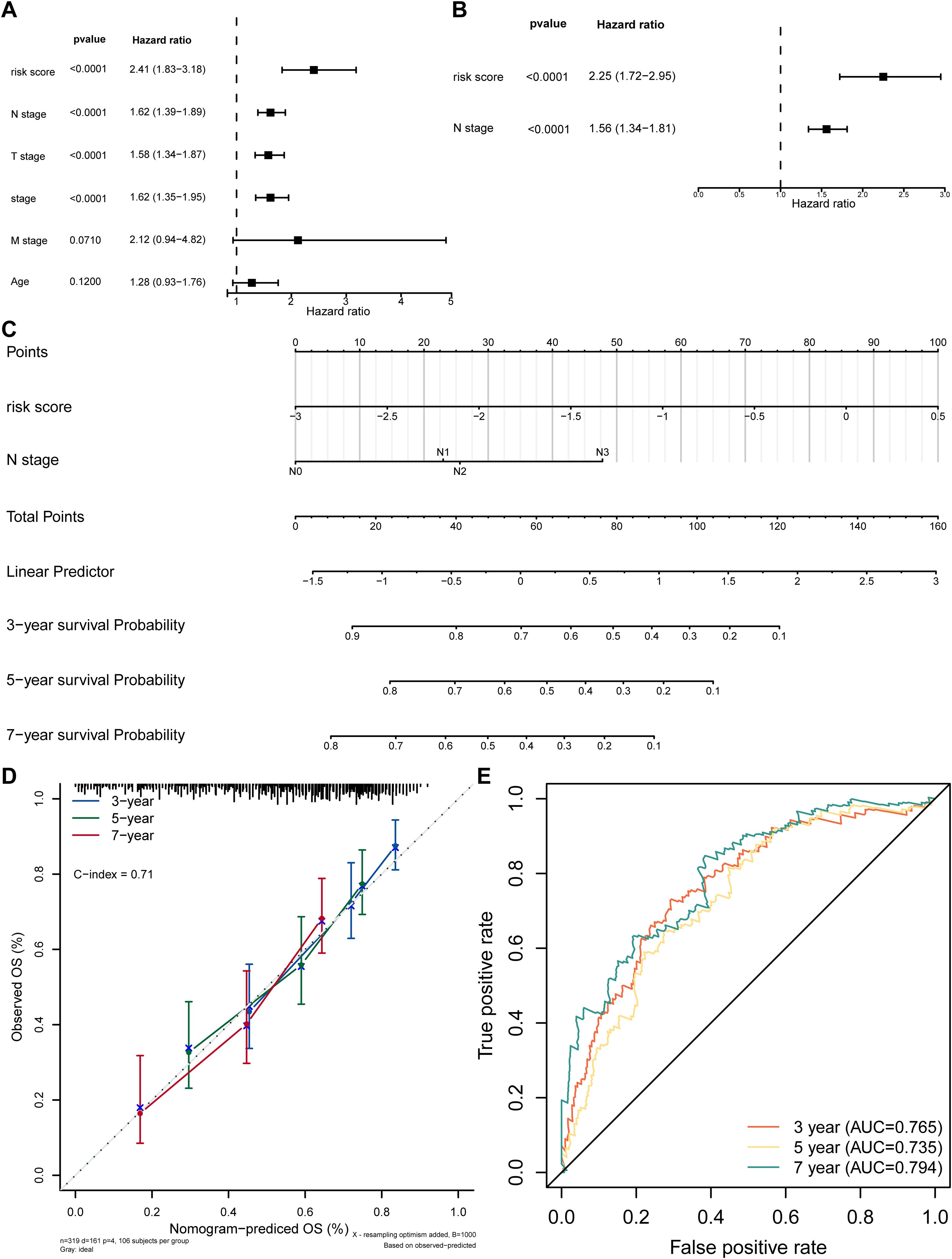 Figure 4. Independent prognostic analysis. (A) Forest plot of univariate Cox regression for independent prognosis. (B) Forest plot of multivariate Cox regression for independent prognosis. (C) Nomogram for predicting survival based on independent prognostic factors. (D) Calibration curve of the nomogram. (E) ROC curve of the nomogram model.