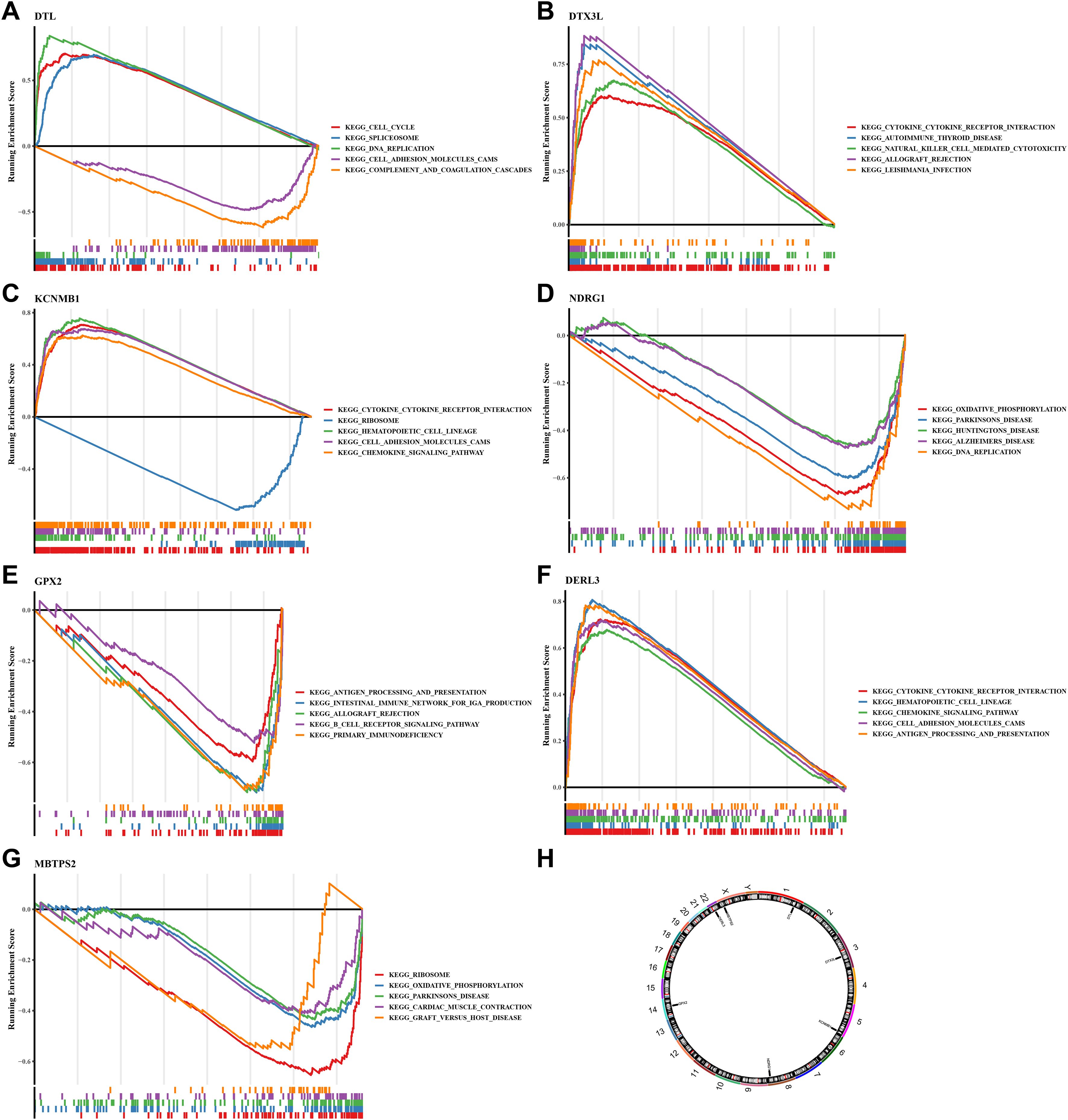 Figure 5. GSEA analysis, chromosomal localization and expression profiles of protein.(A) GSEA analysis of DTL; (B) GSEA analysis of DTX3L; (C) GSEA analysis of KCNMB1; (D) GSEA analysis of NDRG1; (E) GSEA analysis of GPX2; (F) GSEA analysis of DER3L; (G) GSEA analysis of MBTPS2. (H) Chromosomal distribution of prognostic genes. The figure is divided into three parts. The top part shows the calculation process of the enrichment score (ES) value. For each gene from left to right, an ES value is calculated and connected in a line. On the far left, there is a particularly obvious peak, which is the ES value on the gene set phenotype. Each line in the middle part of the figure represents a gene in the gene set and its ranking position in the gene list. The bottom part shows the matrix of the association between genes and phenotypes.