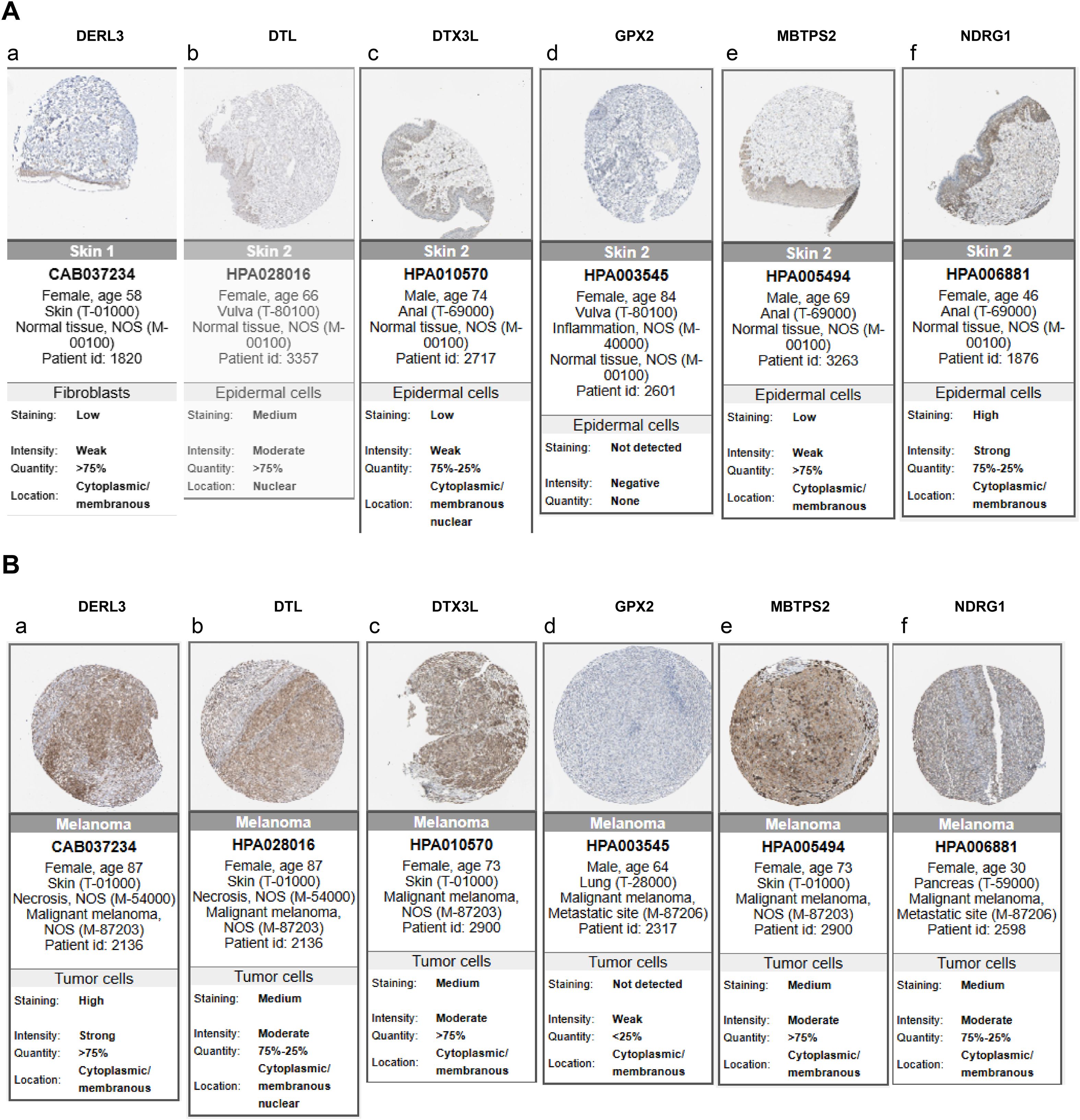 Clarifying the specific location of prognostic genes on chromosomes helped to gain insight into the biological processes and signaling pathways in which prognostic genes might be involved, providing important clues for understanding the genetic basis and molecular mechanisms of SKCM. We found that the DTL, DTX3L, KCNMB1, NDRG1, GPX2, DERL3 and MBTPS2 were localized to chromosomes 1, 3, 5, 8, 14, 22 and X, respectively (Figure 5H). Then, we analyzed these genes by immunohistochemistry images in SKCM and normal tissue adjacent to the cancer. Results demonstrated that except for GPX2, the rest of the prognostic genes were highly expressed in SKCM tissues, especially MBTPS2 (Figures 6A,B) (KCNMB1 did not match related results). These results provided a basis for prognostic assessment of SKCM and for guiding therapeutic decisions.