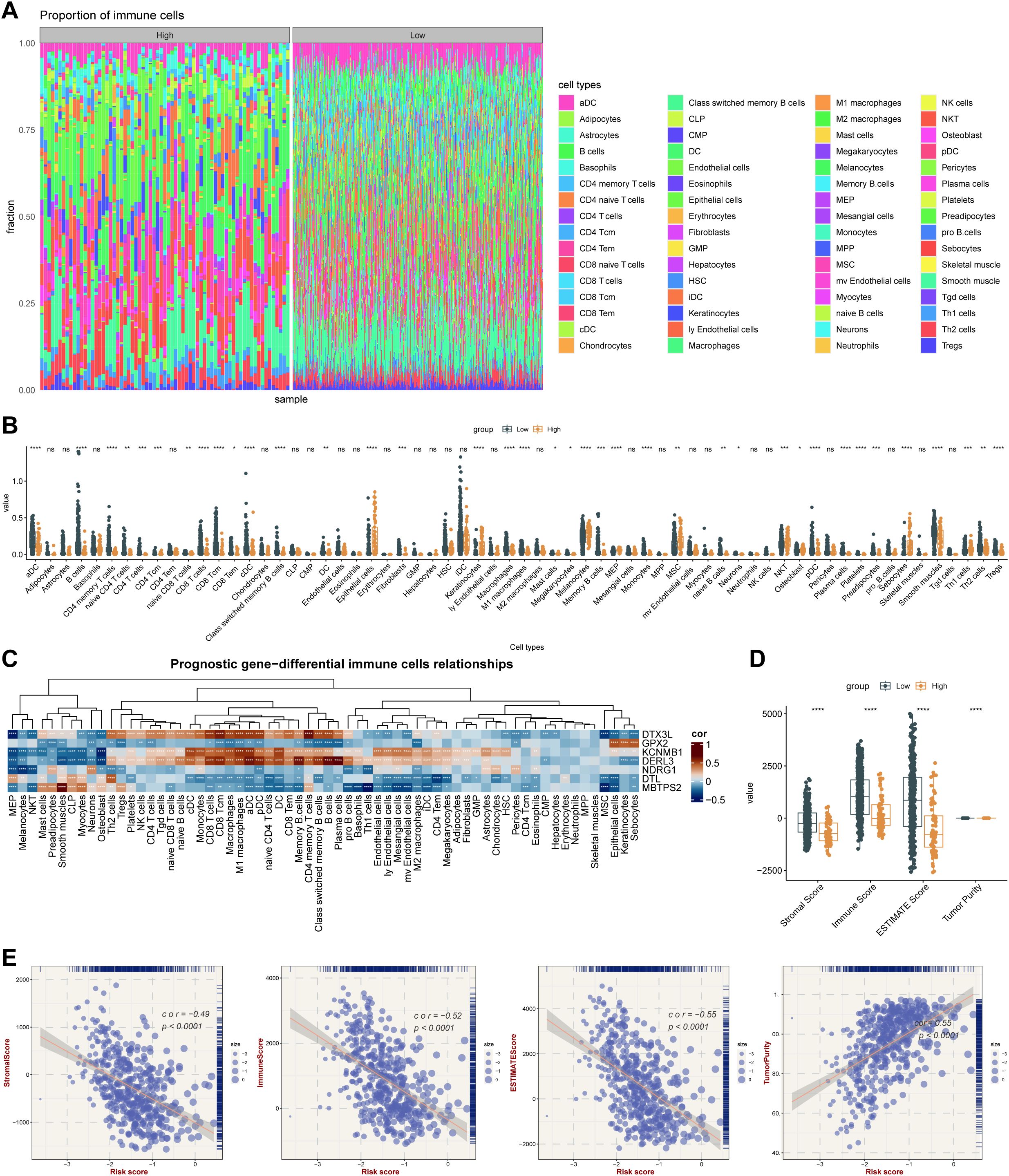 Figure 7. Integrated stress response-related prognostic model for TME analysis. (A) Immune cell infiltration proportion. The x-axis represents individual samples grouped by category, the y-axis shows the proportion of immune cell infiltration, and different colors indicate different cell types. (B) Differences in immune cell enrichment scores between high-risk and low-risk groups in the TCGA cohort. * means p < 0.05, ** means p < 0.01, *** means p < 0.001, **** means p < 0.0001; ns, not significant. (C) Correlation between key genes and immune cells. (D) ESTIMATE analysis results in the TCGA cohort. **** means p < 0.0001. (E) Correlation analysis between ESTIMATE metrics (Stromal Score, Immune Score, ESTIMATE Score, and Tumor Purity) and risk score in the TCGA cohort.