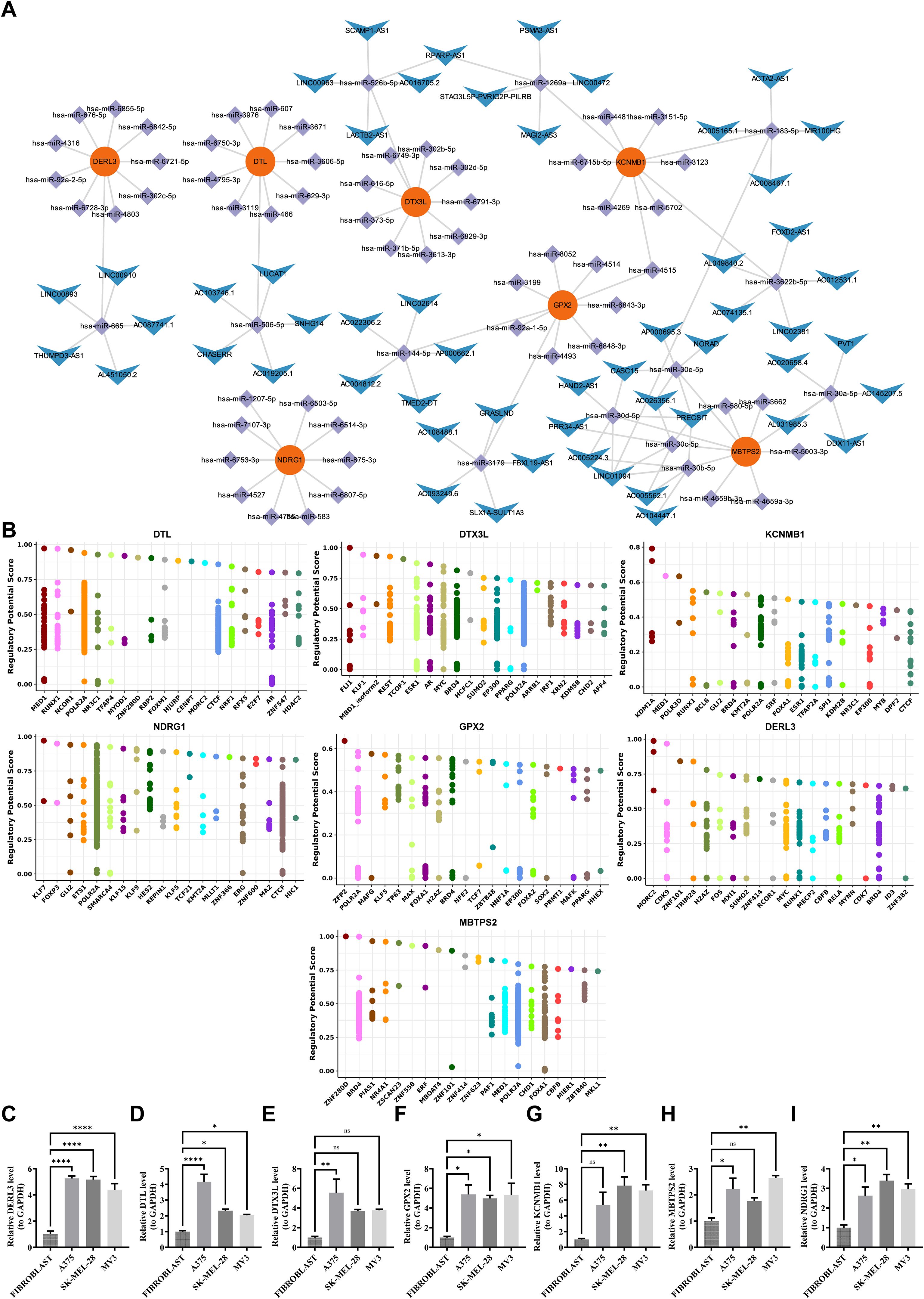 Figure 9. Regulatory networks of characteristic genes and PCR validation. (A) ceRNA network. Red nodes represent key genes, purple nodes represent miRNAs, and blue nodes represent lncRNAs. Connecting lines indicate regulatory relationships among them. (B) Transcription factor prediction. The predicted transcription factors targeting DERL3, DTL, DTX3L, GPX2, KCNMB1, MBTPS2, and NDRG1 are shown. (C-I) Validation of prognostic genes by RT-qPCR. Expression levels of DERL3, DTL, DTX3L, GPX2, KCNMB1, MBTPS2, and NDRG1 were experimentally verified.ns means not significant, *p means p < 0.05, **p means p < 0.01, **** means p < 0.0001.