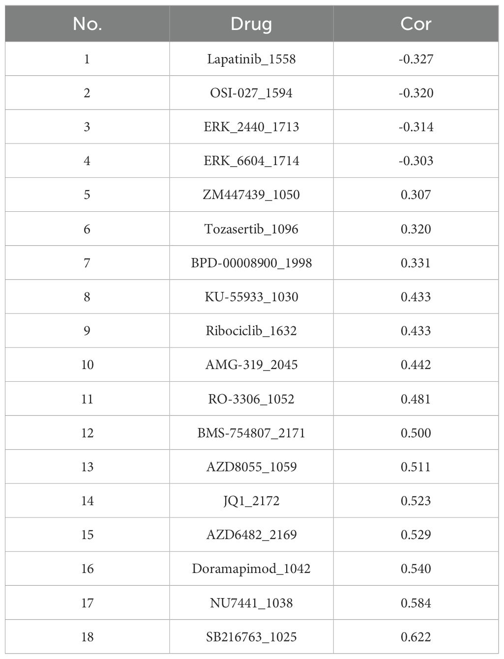 To comprehend the expression of prognostic genes within 42 immune checkpoints (26), firstly, differential immune checkpoints between risk groups were gained (p < 0.05), subsequently, the relatedness between differential immune checkpoints and risk scores was analyzed. The ggplot2 package (v 3.3.6) was applied to visualize the 2 most highly correlated results (|cor| ≥ 0.3, p < 0.05). Besides, data from the v2 version of the GDSC database (https://www.cancerrxgene.org/) were employed as a training set, and the oncoPredict package (v 1.2) (27) was applied to construct a model that predicted the half maximal inhibitory concentration (IC50) values of the drugs for the SKCM samples. Subsequently, the differences in half-inhibitory concentration values of each drug in HRG and LRG and their correlation with risk scores were analyzed (|cor| ≥ 0.3, p < 0.05). Finally, the oncoplot function of the maftools software package (v 2.14) (28) was applied to generate a waterfall plot to explore the variation characteristics of HRG and LRG.