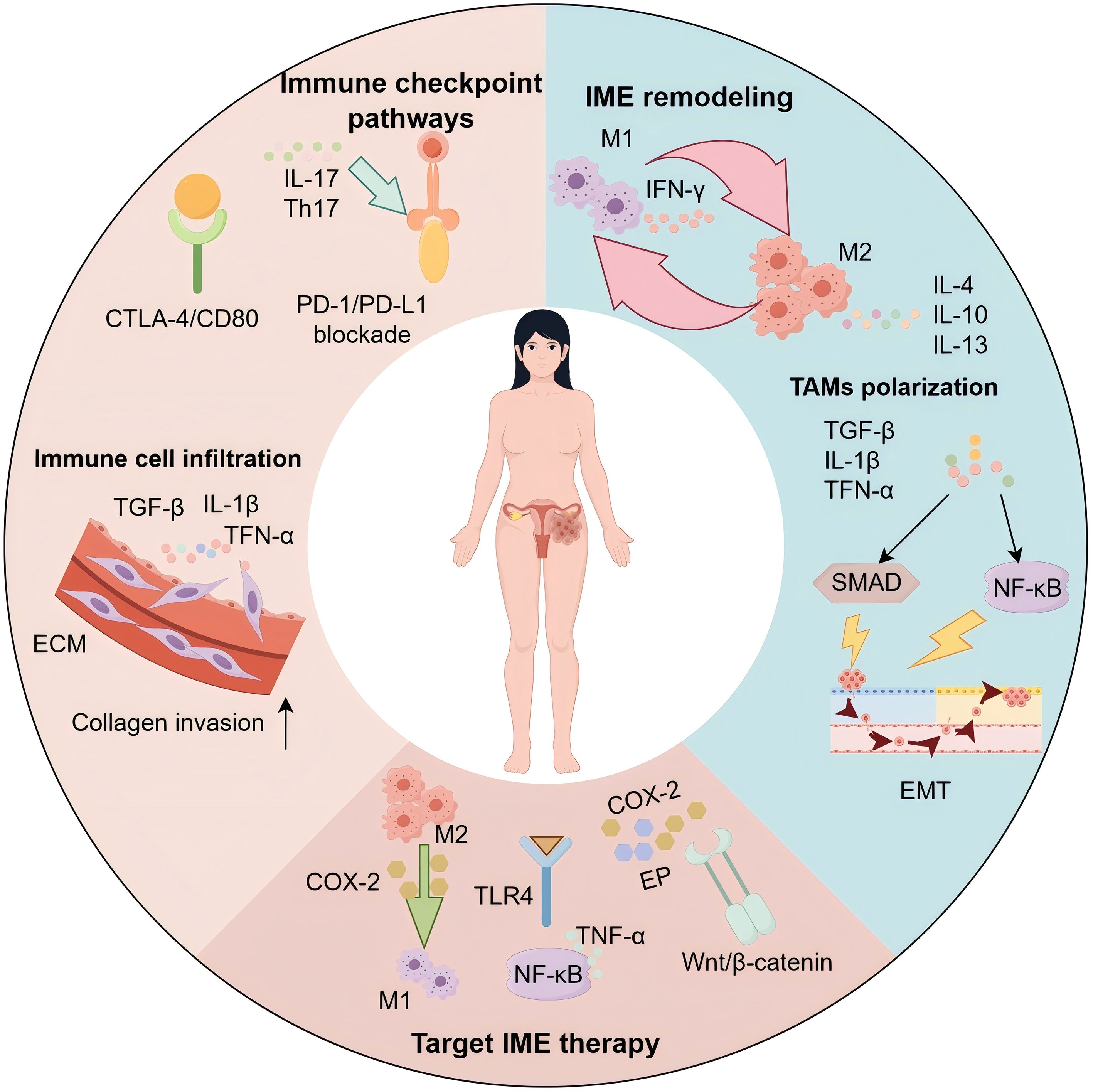 Figure 1. Inflammatory microenvironment of endometrial cancer: mechanisms and therapeutic targets. Schematic of the endometrial cancer (EC) inflammatory microenvironment (IME). Immune-cell infiltration and extracellular matrix (ECM) remodeling driven by TGF-β, IL-1β, and TNF-α facilitate collagen invasion. Immune-checkpoint signaling (PD-1/PD-L1; CTLA-4/CD80) and Th17/IL-17 sustain protumor inflammation. Tumor-associated macrophages (TAMs) polarize from M1 (IFN-γ–associated) to M2 states under IL-4/IL-10/IL-13. Activation of NF-κB and SMAD pathways promotes epithelial–mesenchymal transition (EMT) and immune escape. Targetable nodes highlighted include the COX-2/PGE2/EP axis, TLR4–NF-κB, and Wnt/β-catenin, supporting combinations with checkpoint blockade and strategies that repolarize TAMs toward M1.