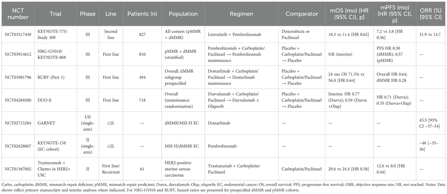 Targeting the IME has become central to EC therapy, as immune cells, stromal components, and cytokine networks drive progression, immune escape, and resistance (80). Combining immunotherapy with microenvironment modulation shows clinical promise. The KEYNOTE-775 study, assessing participants from both pMMR and dMMR groups, found that combining pembrolizumab with lenvatinib markedly enhanced survival without disease progression (7.2 vs. 3.8 months) alongside total survival rates (18.3 vs. 11.4 months) in contrast to the physician’s selection between doxorubicin and paclitaxel (81). In mismatch repair-deficient (dMMR) or microsatellite instability-high (MSI-H) EC, the GARNET trial supported FDA approval of dostarlimab monotherapy, which achieved a 45.5% response rate with durable benefit (81, 82). Immune profiling is emerging as a predictor of therapeutic response. Clinical data from a multicenter trial indicate that patients receiving the combination of pembrolizumab and lenvatinib benefit from enhanced therapeutic outcomes, particularly in cases with substantial CD20+ B-cell infiltration and a high CD8/CD20 ratio within the tumor microenvironment (83, 84). Likewise, endometrial tumors harboring p53 mutations, enriched in tumor-infiltrating lymphocytes (TILs) and expressing high levels of immune evasion molecules, appear to be especially responsive to combined treatment strategies involving checkpoint inhibitors and precision-targeted therapies, including those directed at PARP or HER2 pathways (85). Stromal remodeling also contributes to resistance. Although genetically stable, stromal cells can be reprogrammed by tumor-derived signals to promote immune suppression and metastasis, underscoring the therapeutic potential of targeting tumor–stroma crosstalk (86–88). Together, these insights support a precision framework that integrates immune and stromal profiling with IME-targeted therapies to optimize outcomes in EC. Together, these insights support a precision framework that integrates immune and stromal profiling with IME-targeted therapies to optimize outcomes in EC. Table 1 summarize pivotal randomized and registration trials across first- and later-line settings, stratified by dMMR/MSI-H versus MSS/pMMR and listing key endpoints (OS, PFS, ORR).