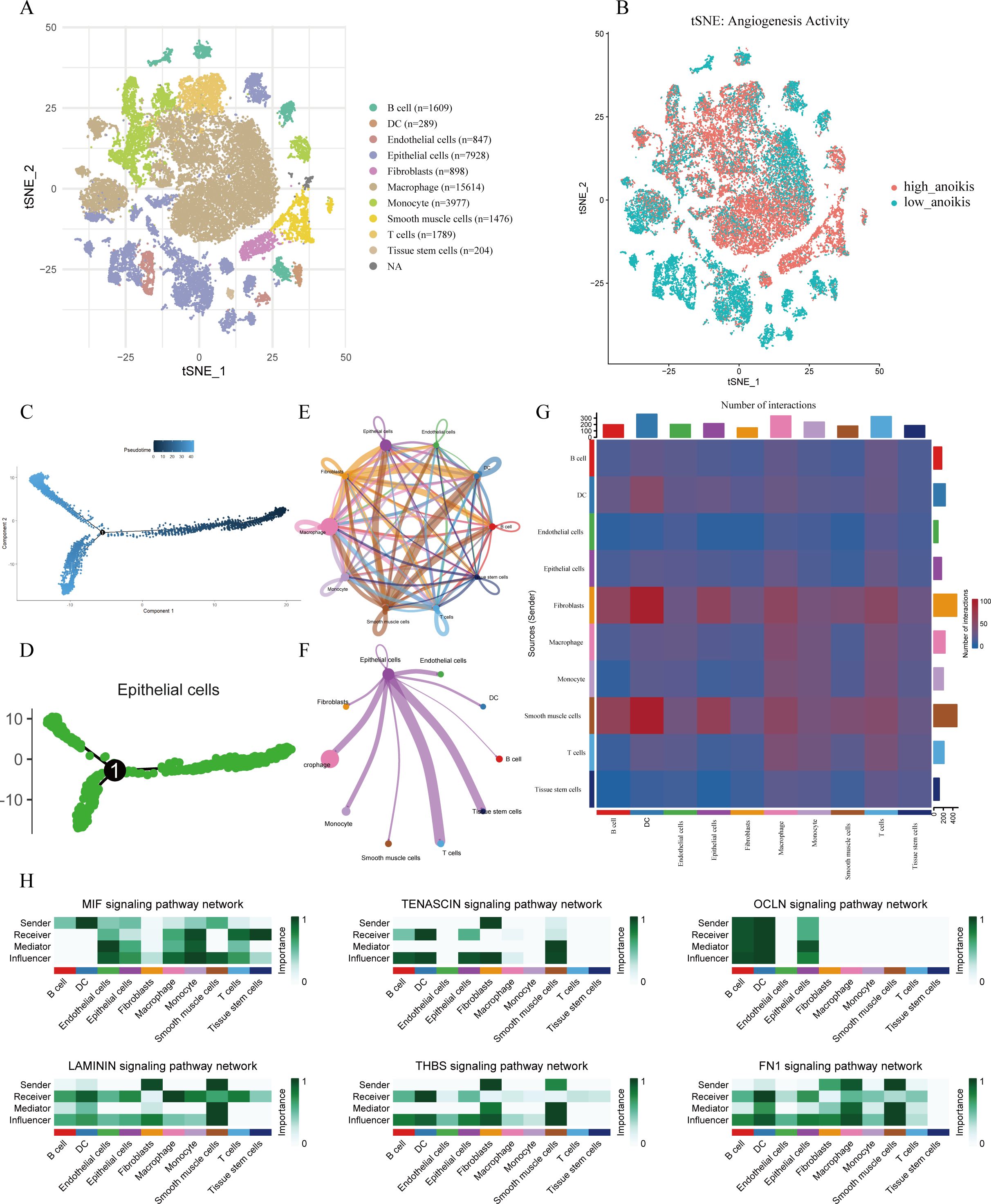Figure 1. Single-cell transcriptomic analysis of LUAD. t-SNE visualization of cell clusters, annotated into 11 major cell types based on canonical marker genes. (B) Angiogenesis Activity Visualization. Visualization of angiogenesis-related AUC scores on the t-SNE plot; color indicates the relative score intensity. (C) Pseudotime trajectory analysis of all analyzed cell populations. (D) Pseudotime trajectory of epithelial subpopulations showing potential differentiation paths. (E) Global overview of intercellular communication networks among all cell types. (F) Cell-cell interaction network centered on epithelial cells. (G) Heatmap showing interaction intensity among cell types. (H) Outgoing and incoming signaling patterns of key pathways across cell types, with emphasis on epithelial cells.