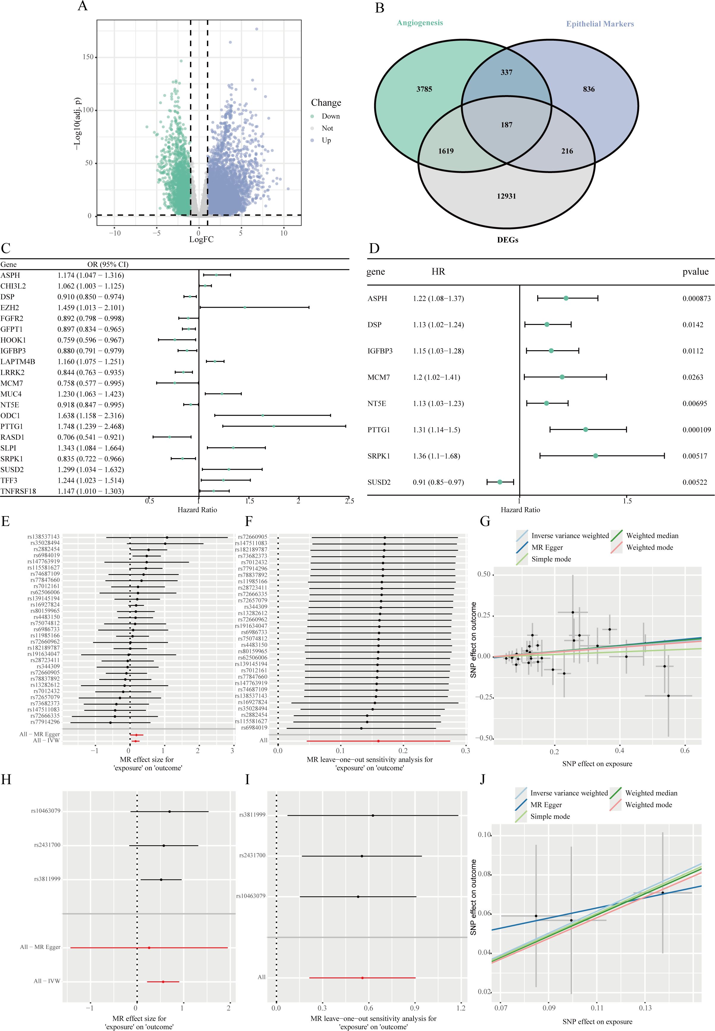 Figure 2. Identification of angiogenesis-related hub genes in LUAD epithelial cells and MR analysis. (A) A volcano plot demonstrating the genes that are DEGs when comparing lung adenocarcinoma tissues to corresponding adjacent normal samples within the TCGA-LUAD dataset. (B) A Venn diagram illustrating the intersection of DEGs identified from the TCGA dataset, epithelial cell-specific marker genes, and genes linked to angiogenesis. (C) Forest plot of significantly associated genes from MR analysis among intersecting genes with cis-eQTL data, evaluating the causal relationship between their expression and LUAD risk. (D) Forest plot of positively associated genes identified by univariate Cox regression analysis of MR-significant genes, assessing their correlation with OS. (E-G) Equivalent plots for ASPH, including forest plot (E), leave-one-out analysis (F), and MR scatter plot (G). (H-J) Equivalent plots for PTTG1, including forest plot (H), leave-one-out analysis (I), and MR scatter plot (J).