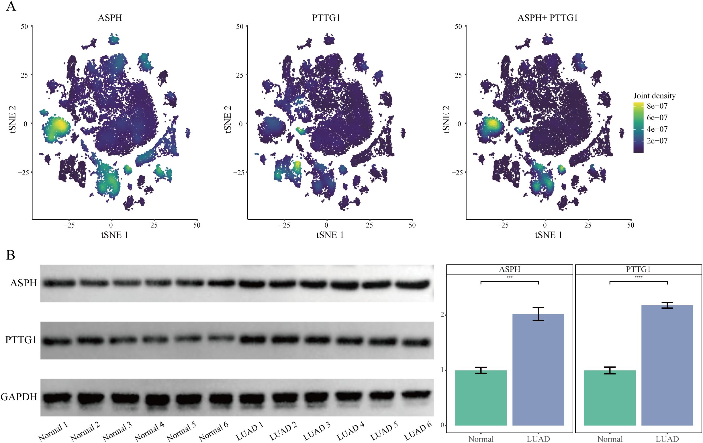 Figure 3. Validation of ASPH and PTTG1 expression. (A) t-SNE plots overlaid with expression densities of ASPH, PTTG1, and their combined signature. Color intensity reflects expression levels. (B) Western blot analysis of ASPH and PTTG1 protein expression in Lung Adenocarcinoma Tissue and Normal Adjacent Tissue.