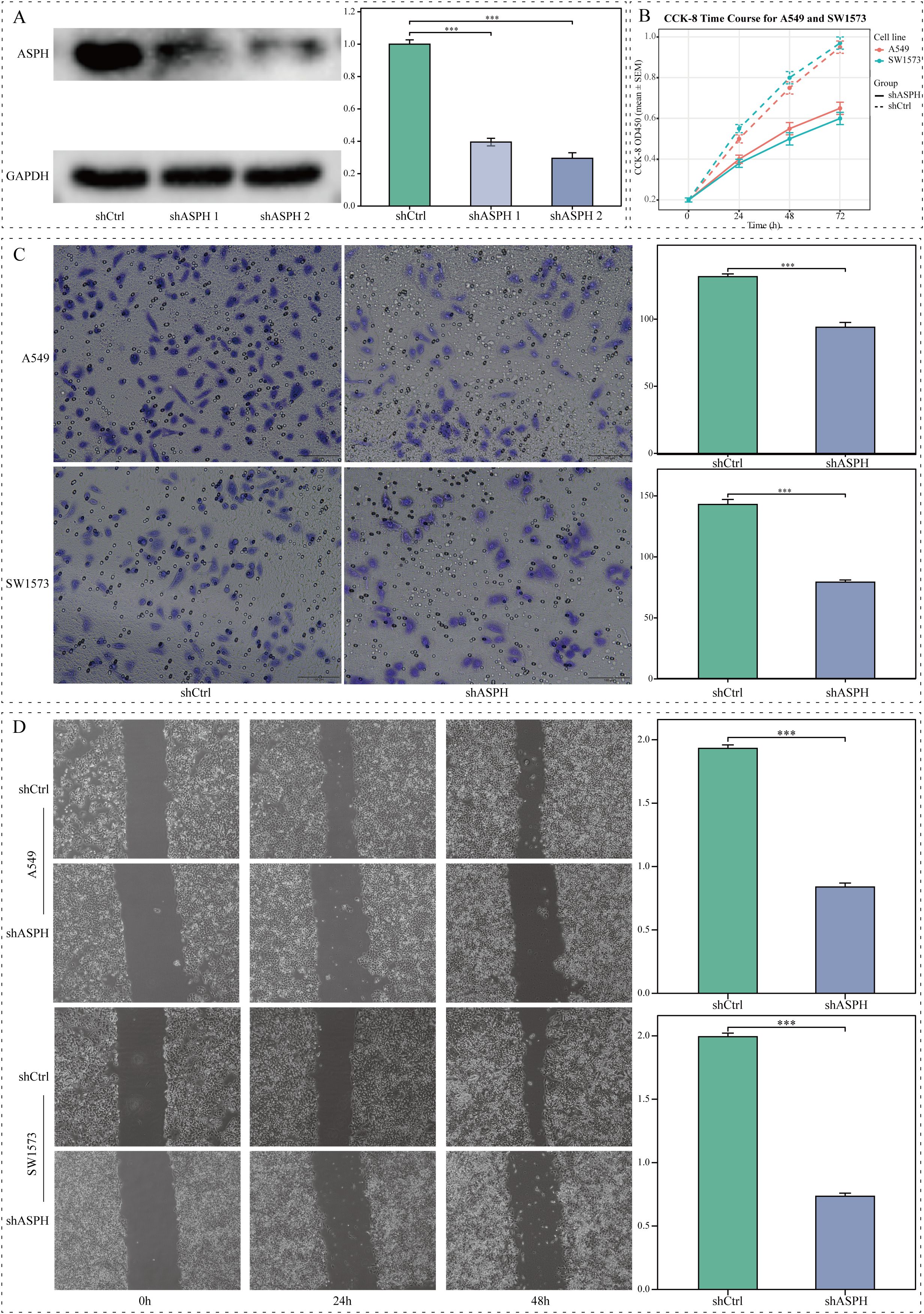 To directly validate the functional role of ASPH in LUAD cells, we knocked down its expression in SW1573 and A549 cell lines using lentivirus-mediated shRNA. Western Blot results confirmed that, compared to the shCtrl control group, two independent shRNAs (shASPH-1 and shASPH-2) effectively reduced ASPH protein levels. The more efficient shASPH-1 was selected for subsequent functional experiments (Figure 4A). The CCK8 proliferation assay, visualized as a line graph, revealed that ASPH knockdown led to a significant, time-dependent inhibition of proliferative capacity in both A549 and SW1573 cells compared to the control group (Figure 4B). Subsequently, we assessed the impact of ASPH on cell invasion and migration using wound-healing and Transwell assays. The results showed that ASPH knockdown significantly reduced the number of cells that invaded through the Matrigel matrix (Figure 4C) and markedly delayed the closure of the scratch area (Figure 4D). Collectively, these in vitro results confirm that ASPH is a critical molecule required for maintaining the proliferation, migration, and invasion of LUAD cells, providing strong functional support for our bioinformatics analyses and clinical association findings.