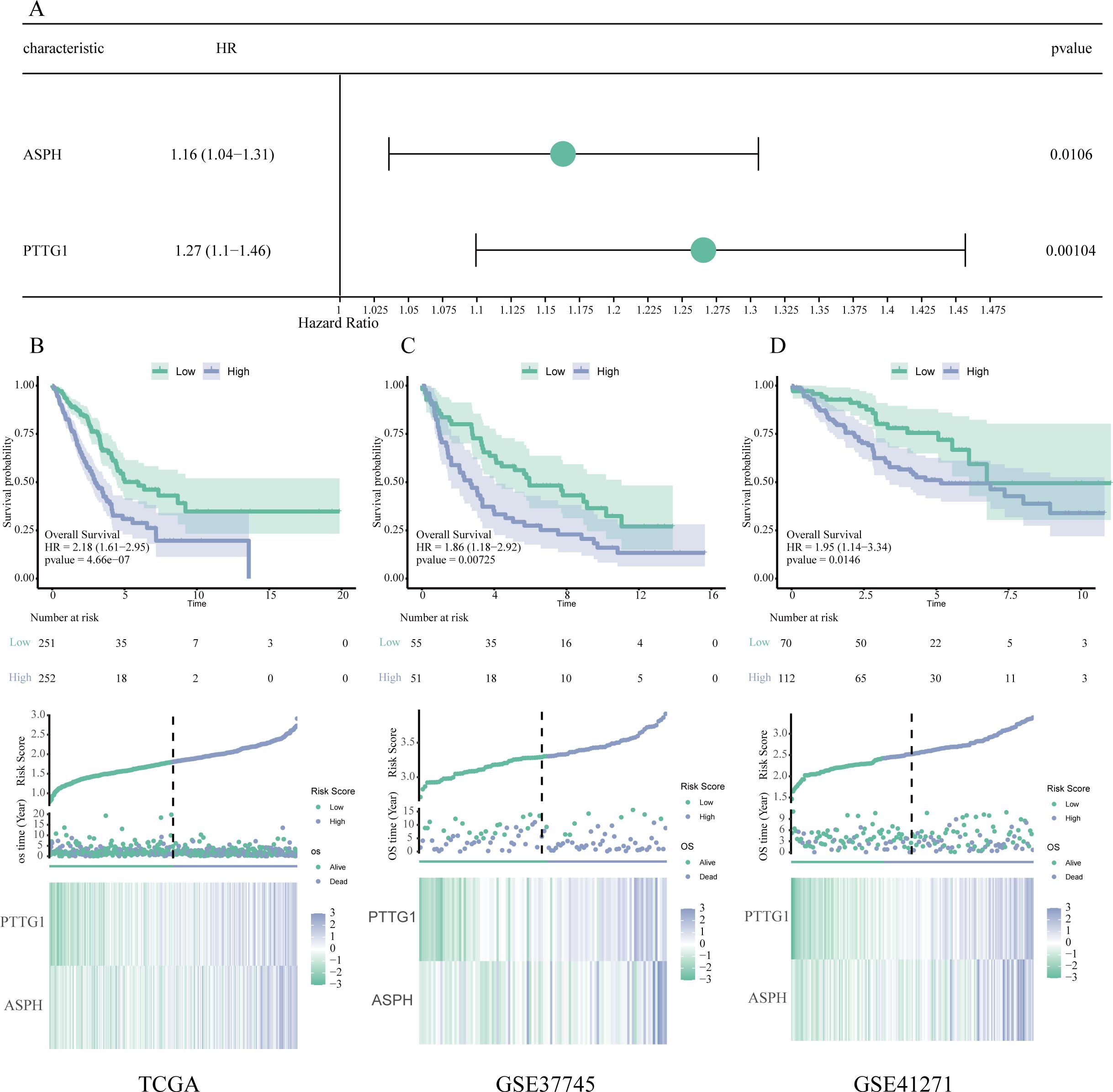 Figure 5. Validation and development of a prognostic model based on key genes. (A) Forest plot generated from multivariate Cox regression analysis, showcasing the hazard ratios and 95% confidence intervals for ASPH and PTTG1, thereby affirming their roles as independent prognostic indicators. (B–D) Assessment of the prognostic model using data from the TCGA (B), GSE37745 (C), and GSE41271 (D) datasets. Each subsection contains a Kaplan–Meier survival analysis (top), distribution plots of risk scores and survival outcomes (middle), as well as expression heatmaps for ASPH and PTTG1 (bottom).