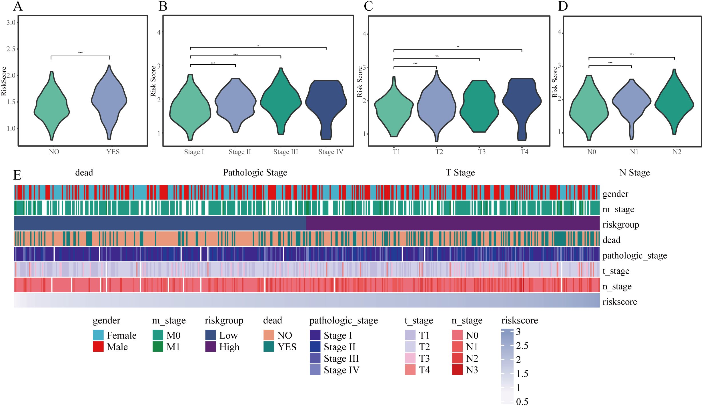 Figure 6. Correlation between risk score and clinical characteristics. (A–D) Violin plots illustrating variations in risk scores among different subgroups: (A) survival status, (B) pathological stage, (C) T classification, and (D) N classification. (E) Heatmap depicting the relationships between risk score and clinical variables such as sex, stage, and prognosis. * P < 0.05, ** P < 0.01, *** P < 0.001.