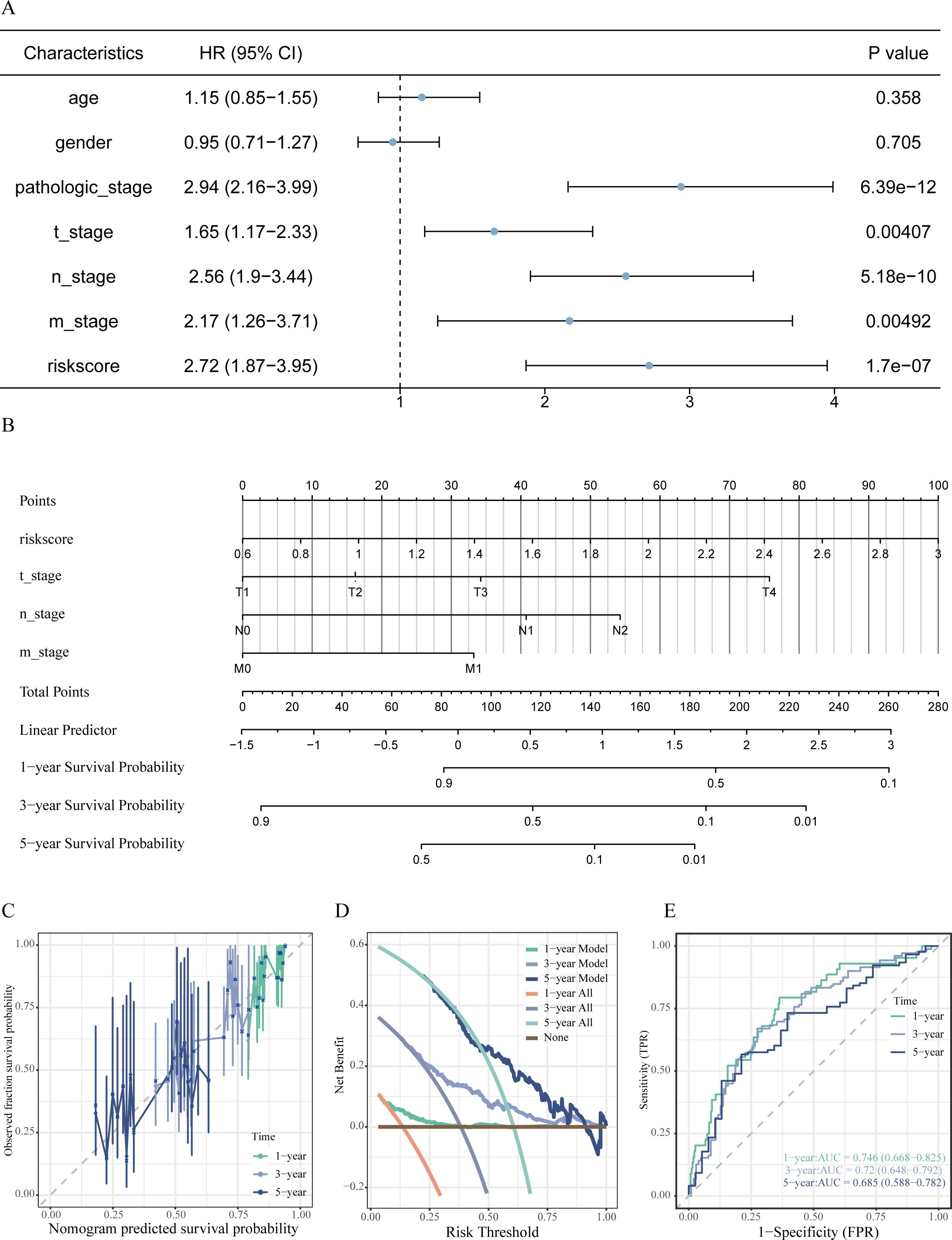 Figure 7. Development and assessment of the prognostic nomogram. (A) Forest plot from univariate Cox regression analysis identifying clinical factors linked to OS in LUAD patients. (B) Prognostic nomogram integrating risk score and significant clinical characteristics to predict 1-, 3-, and 5-year OS probabilities. (C) Calibration curves evaluating the alignment between predicted and actual OS at 1, 3, and 5 years. (D) Decision curve analysis assessing the net clinical benefit provided by the nomogram at various time points. (E) Time-dependent ROC curves along with associated AUC values illustrating the predictive efficacy of the model.