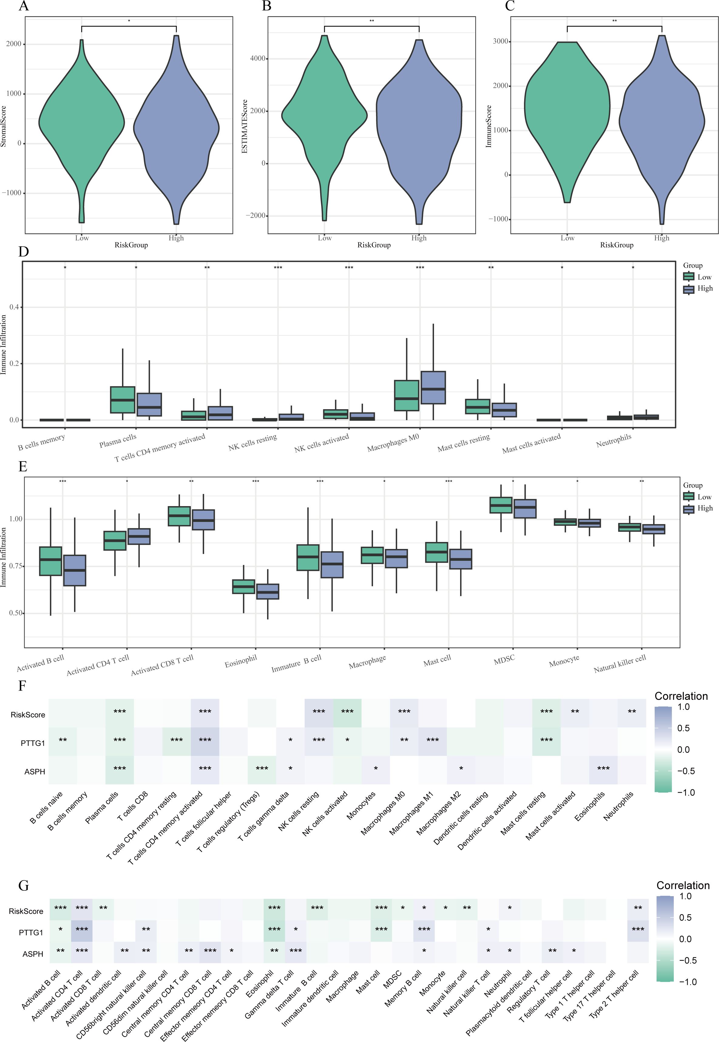 Figure 8. Relationship between characteristics and Risk Score of the tumor microenvironment. (A-C) Violin plots demonstrating variations in StromalScore (A), ESTIMATEScore (B), and ImmuneScore (C) among low- and high-risk cohorts. (D) Boxplots illustrating the patterns of immune cell infiltration assessed by ssGSEA across the different risk groups. (E) Boxplots presenting the disparities in immune cell infiltration as derived from CIBERSORT between the two groups. (F-G) Heatmaps that reveal correlations between the risk score, expression of hub genes, and immune cell populations evaluated through CIBERSORT (F) and ssGSEA (G). * P < 0.05, ** P < 0.01, *** P < 0.001.