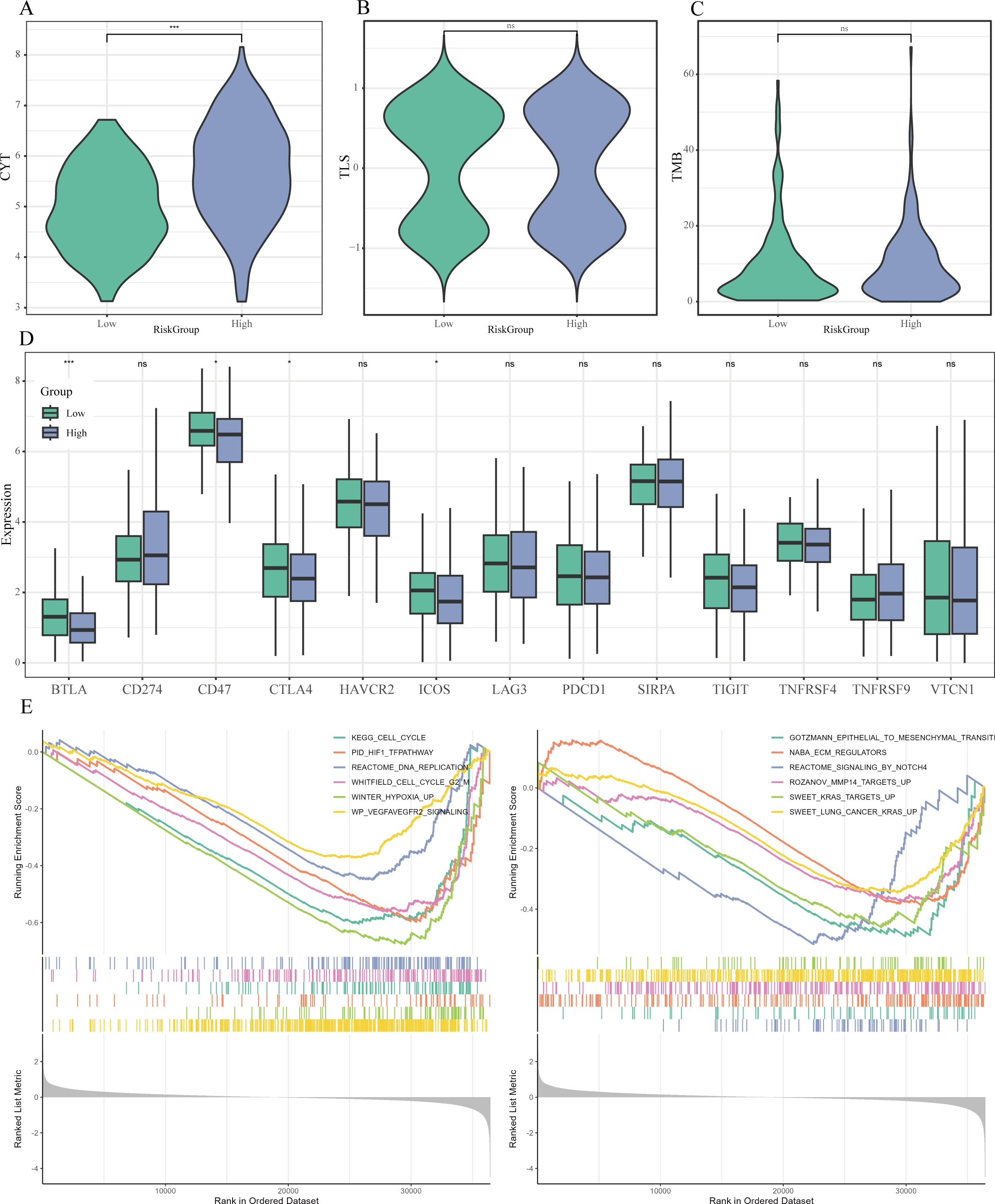Figure 9. Immune therapy markers and pathway enrichment linked to Risk Score. (A-C) Violin plots examining the differences in cytolytic activity (CYT) scores (A), tertiary lymphoid structure (TLS) scores (B), and tumor mutational burden (TMB) (C) between risk categories. (D) Boxplots highlighting the expression variations of essential immune checkpoint molecules across the risk groups. (E) GSEA findings that display representative pathways that are significantly enriched in the high-risk category. * P < 0.05, ** P < 0.01, *** P < 0.001.