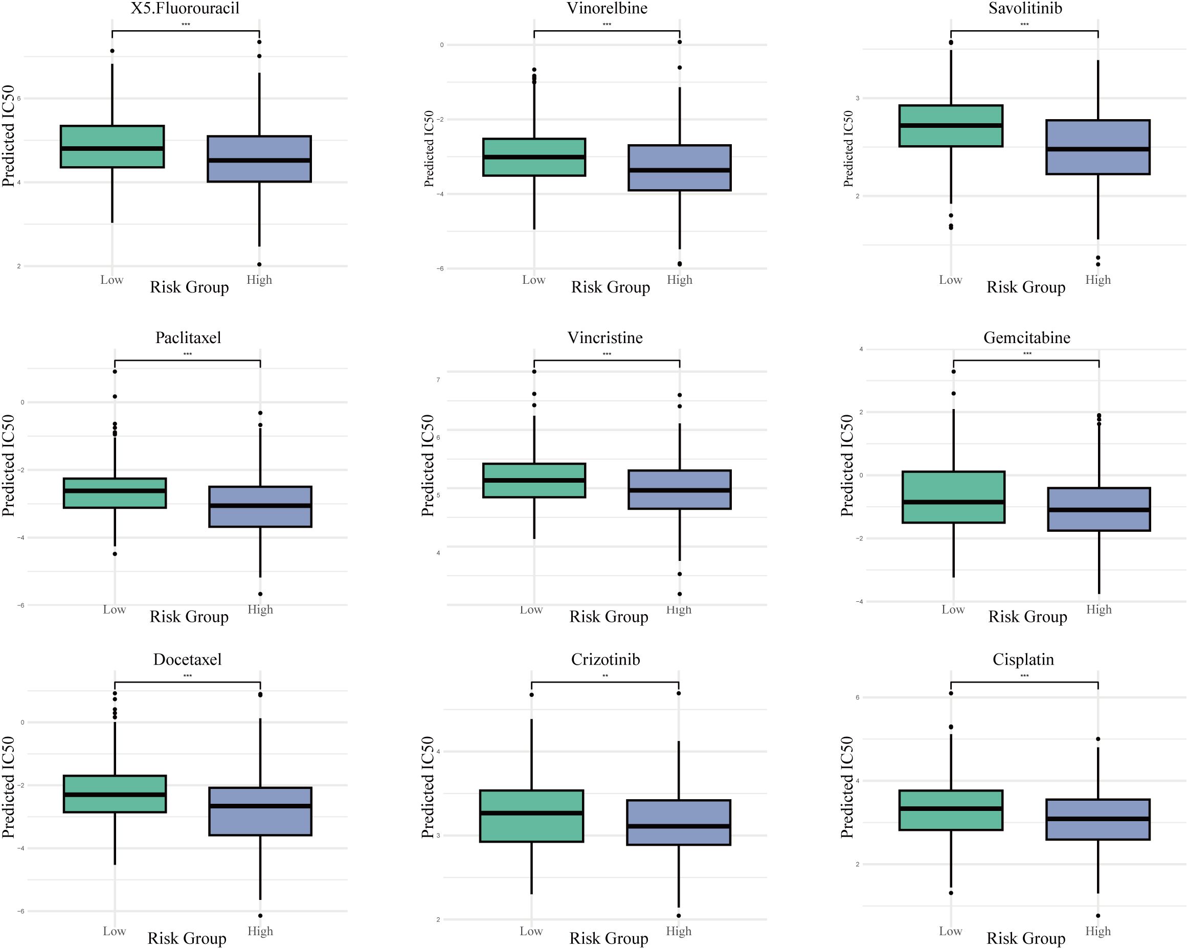 The prediction of drug responses utilizing the Genomics of Drug Sensitivity in Cancer database alongside the oncoPredict algorithm suggested that patients classified with elevated risk scores are more inclined to demonstrate increased sensitivity towards various chemotherapeutic and targeted treatment options. These results indicate that individuals within the high-risk cohort could potentially exhibit a more advantageous response to therapeutic agents such as Paclitaxel, Docetaxel, Vinorelbine, Cisplatin, Gemcitabine, Crizotinib, Savolitinib, Vincristine, and 5-Fluorouracil, as indicated by lower predicted IC50 values (Figure 10).