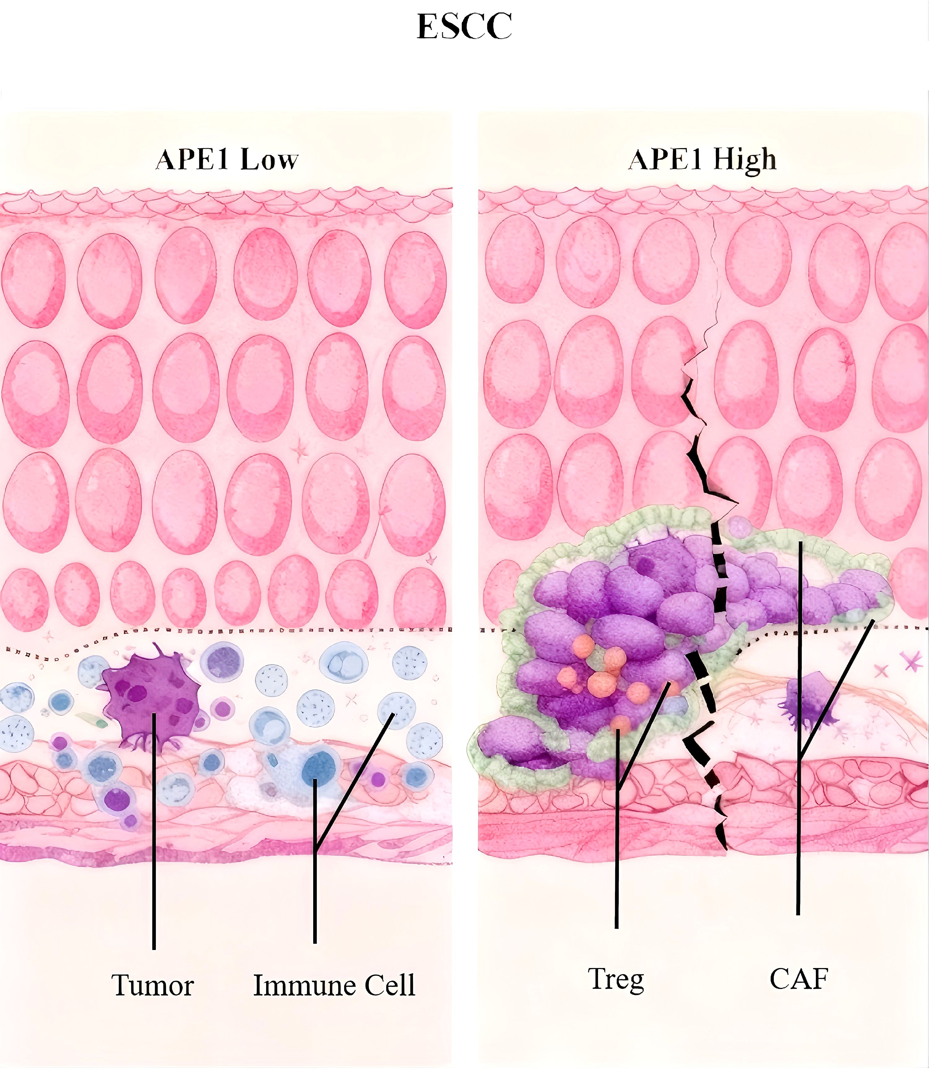 Collectively, we propose the following scientific hypothesis: In ESCC patients undergoing radical resection with adjuvant chemotherapy, elevated APE1 expression (1) promotes increased tumor infiltration depth and advanced T-stage, and (2) induces significant enrichment of CAFs and Tregs, fostering an immunosuppressive tumor microenvironment that ultimately contributes to poor chemotherapeutic outcomes. This implies that early-stage ESCC patients with low APE1 expression may derive greater benefit from postoperative single-agent chemotherapy, whereas those with high expression may require combinatorial therapeutic strategies.