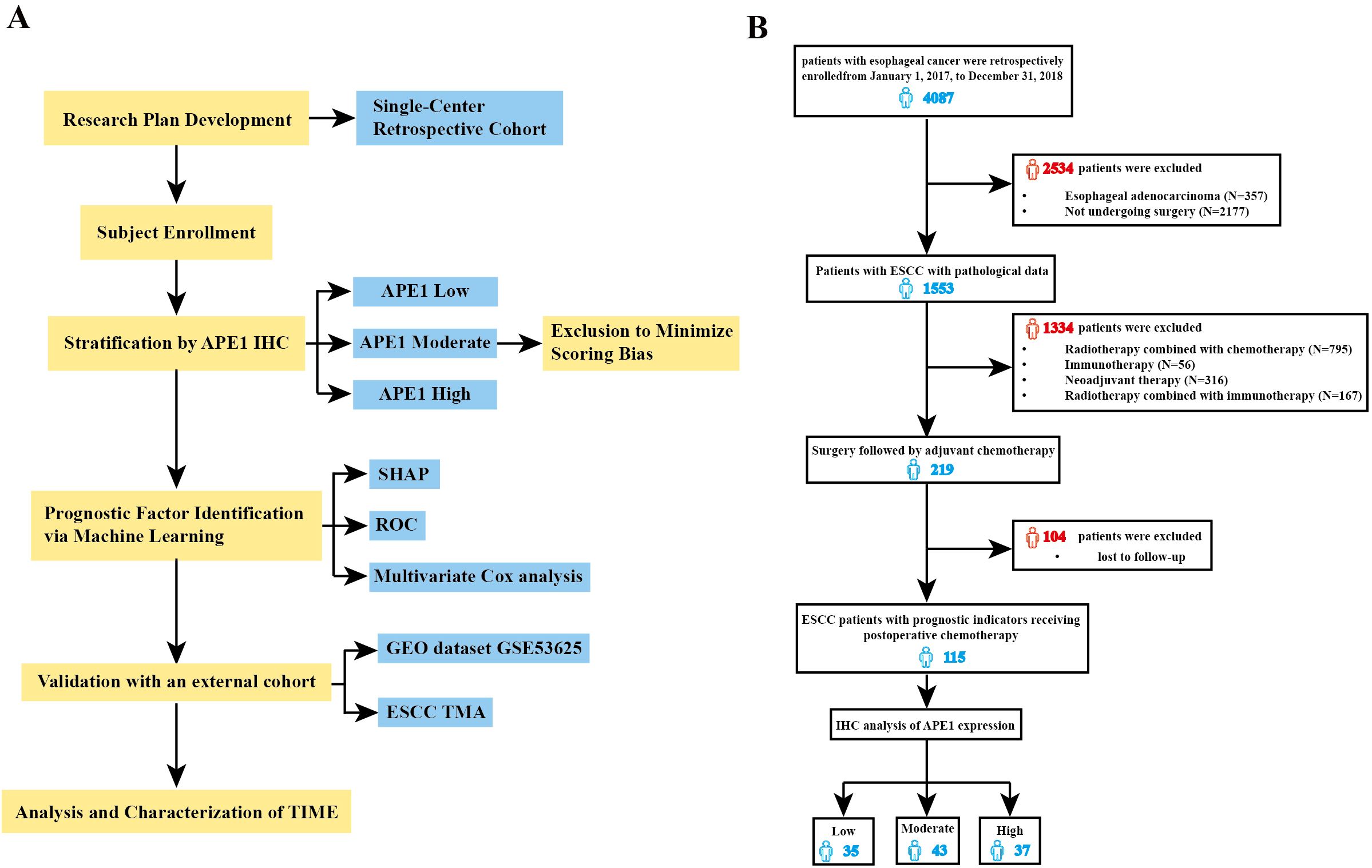 To further investigate the clinical value and utility of APE1 as a prognostic biomarker in ESCC, we performed this study according to the research workflow detailed in Figure 1A. A total of 115 patients with ESCC who received chemotherapy after surgery were included in this study. The inclusion and exclusion criteria are shown in Figure 1B, and baseline characteristics are presented in Table 1. This retrospective study analyzed data from 4,087 esophageal cancer patients treated at our hospital between 2017 and 2018. Of these, 1,533 underwent surgical resection at our institution. After applying inclusion criteria—availability of archived surgical paraffin-embedded specimens and receipt of only platinum-based adjuvant chemotherapy—219 patients were enrolled. These individuals were followed for five years. As of December 31, 2024, complete five-year survival data were available for 115 patients, who formed the final study cohort. The study protocol was approved by the Ethics Committee of the Army Medical Center of the PLA (Approval No. 2023-189). Tumor tissue samples were obtained from Specimen No. 1 (i.e., representative tumor tissue) archived in the hospital’s Department of Pathology. Overall Survival (OS) was defined as the primary endpoint, and Disease-Free Survival (DFS) as the secondary endpoint.