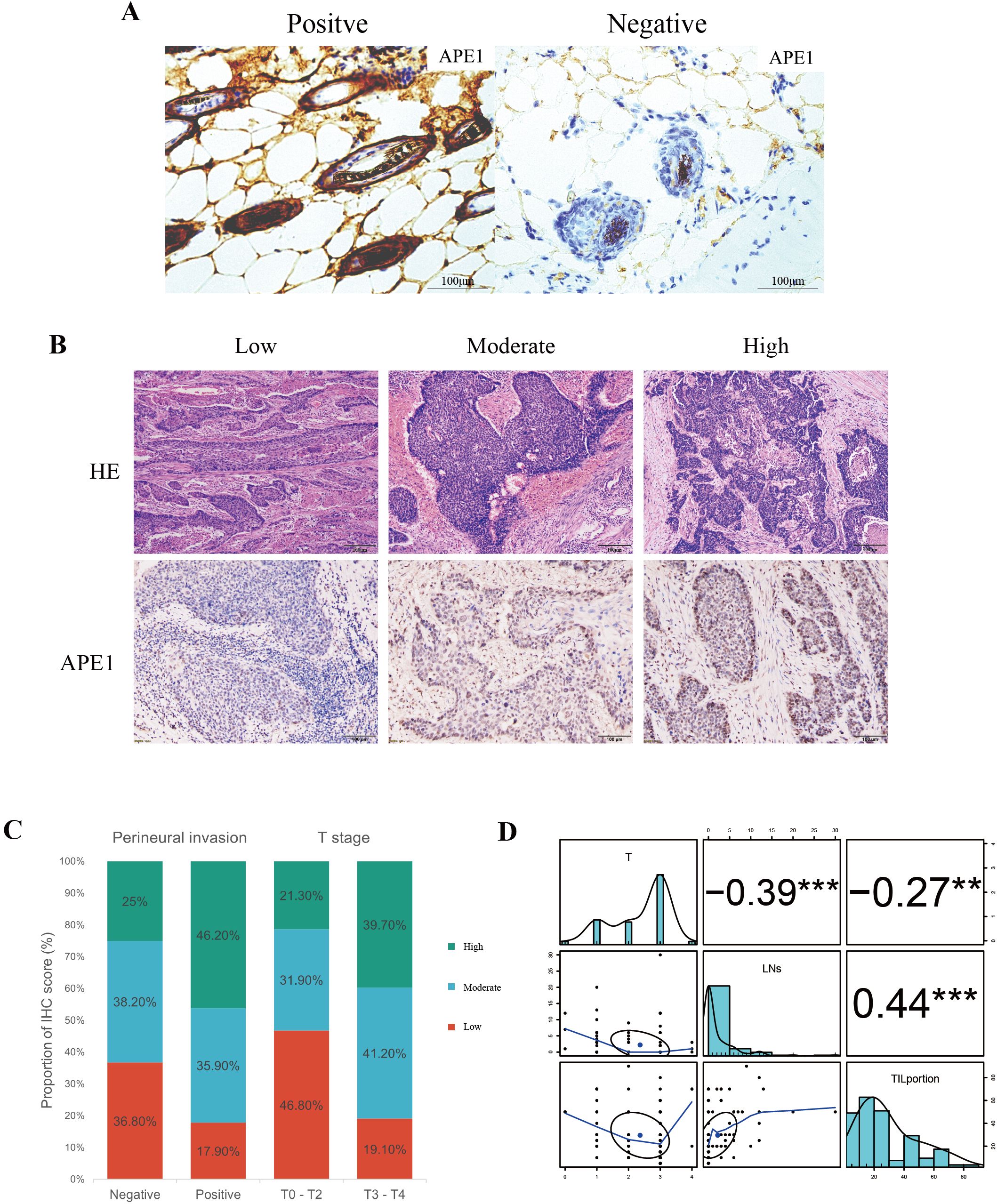 Figure 2. Correlation between APE1 expression and clinicopathological features. (A) Positive and Negative Controls for IHC. (B) HE staining and IHC staining of APE1of patient tumor specimens. (C) Percentage bar charts of patients in different subgroups in perineural invasion and T stage. (D) Analysis of patient T-staging in correlation with TIL and TLS, “**” indicates p < 0.01 and “***” indicates p < 0.001.