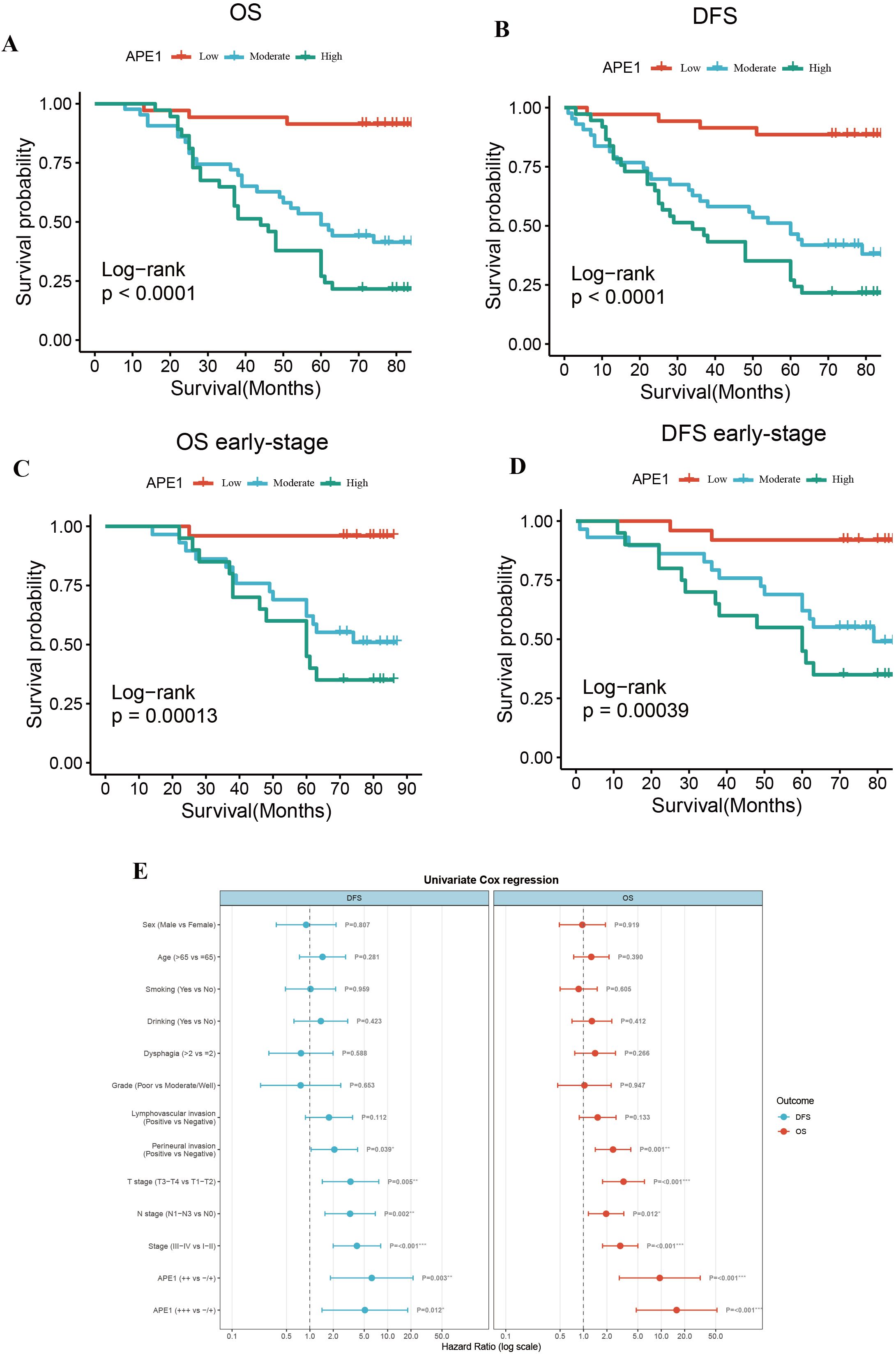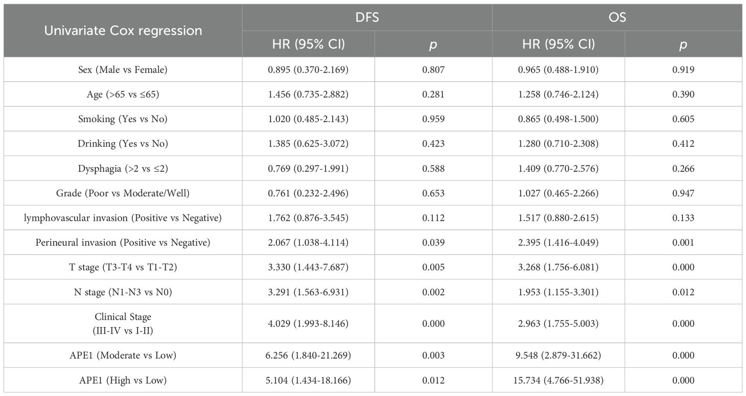 To mitigate the limitations associated with semi-quantitative assessment, we dichotomized the patient cohort into discrete groups with high or low APE1 expression for a robust investigation of its role in ESCC. Kaplan-Meier analysis demonstrated that the low APE1 expression patients had significantly longer median OS compared to the high-expression (79 months vs. 44 months; HR = 15.74, 95% CI 4.75–52.15, p < 0.001), and similarly exhibited superior median DFS (77 months vs. 34 months; HR = 11.85, 95% CI 4.13–34.00, p < 0.001) (Figures 3A, B). Subgroup analysis of early-stage operable patients (Tis-II stage) further revealed that high APE1 expression remained significantly associated with poorer outcomes: the low-expression group showed a median OS of 80 months versus 60 months in the high-expression group (HR = 23.52, 95% CI 3.06–180.81, p < 0.001), and a median DFS of 80 months versus 60 months (HR = 11.58, 95% CI 2.60–51.59, p < 0.001) (Figures 3C, D). Univariate Cox regression analysis identified perineural invasion, T stage, N stage, clinical stage, and APE1 expression as significant predictors for both DFS and OS (Figure 3E, Table 2).