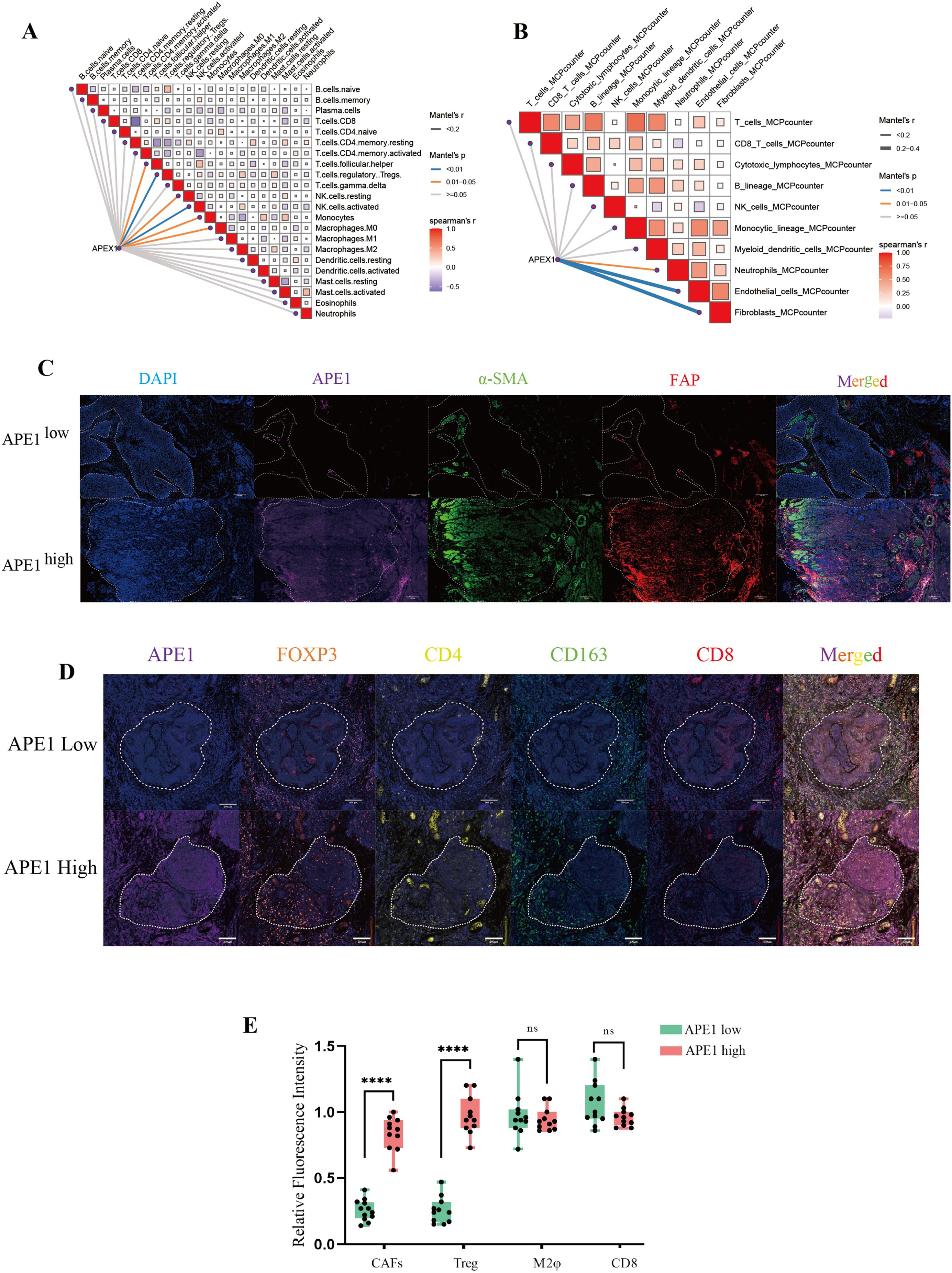 Figure 6. Immunological microenvironmental analysis. (A, B) GEO database GSE53625, network diagram of APEX1 correlation with immune infiltration analysis. (C) mIHC detection of APE1, a-SMA and FAP expressions in patient pathology specimens, scale bar = 100 μm. (D) mIHC detection of FOXP3, CD163, CD4 and CD8 expressions in patient pathology specimens mice, scale bar = 200 μm. (E) Statistical analysis of the relative fluorescence intensities of a-SMA, FAP, FOXP3, CD4, CD163 and CD8 in different patients (n = 10), “****” indicates p < 0.0001 and “ns” indicates none significance.