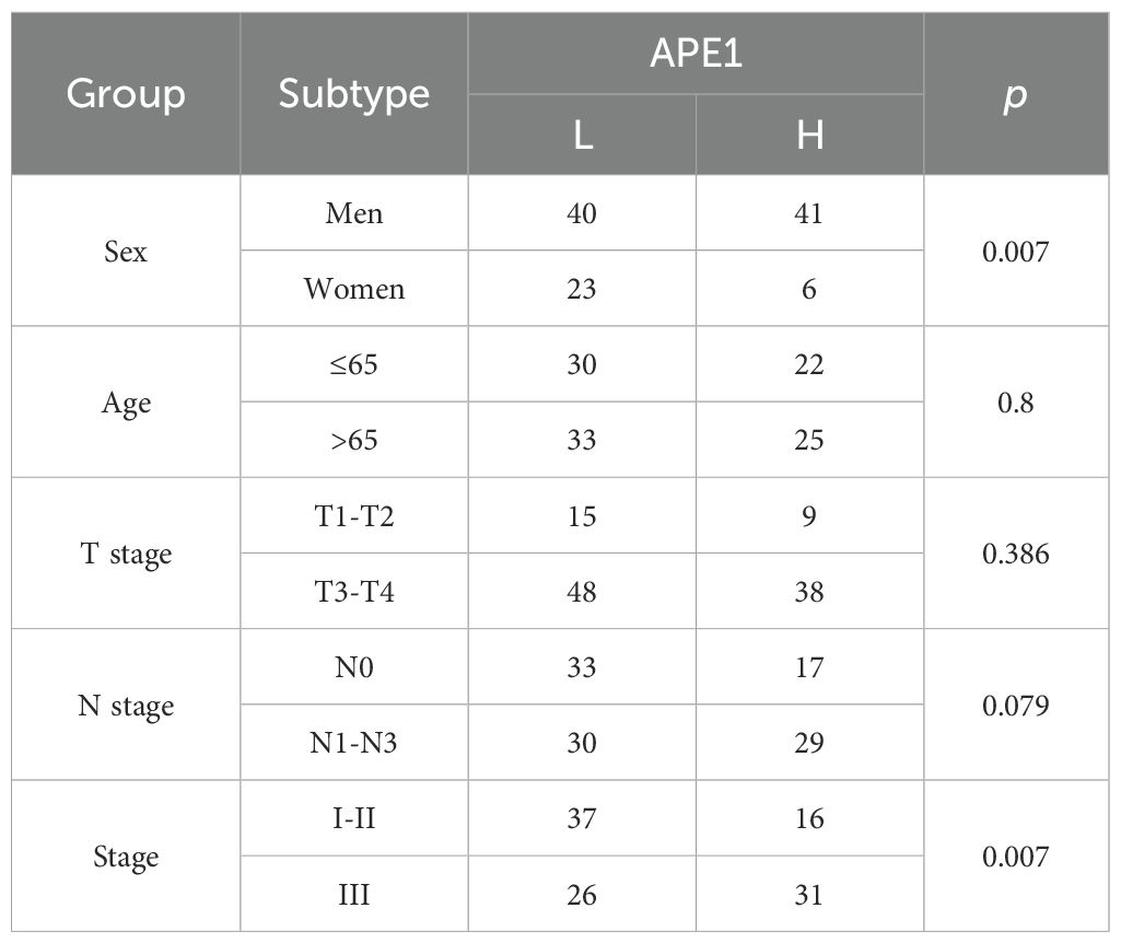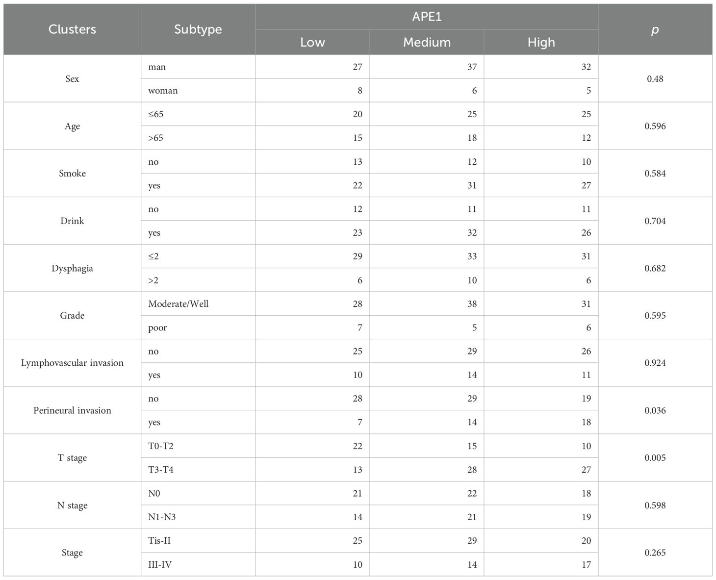 This study presents a systematic analysis of the clinicopathological features and molecular expression profiles in 115 cases of operable ESCC. It represents the comprehensive demonstration that elevated APE1 expression is significantly correlated with adverse prognostic outcomes in patients receiving postoperative adjuvant chemotherapy. Multivariate Cox regression modeling confirmed that high APE1 expression serves as an independent prognostic indicator for both DFS and OS. This statistical significance remained robust even after adjusting for key clinicopathological parameters, including T-stage, perineural invasion, and other relevant factors (Figure 4, Table 2). Of particular note, within the subgroup of T1–2 stage patients, high APE1 expression effectively stratified distinct prognostic trajectories. In clinical practice, the majority of patients eligible for surgery present with early-stage disease. Our findings indicate that APE1 expression also serves as a strong prognostic biomarker for chemotherapy response in this patient population. This provides a novel biomarker that may aid in predicting the effectiveness of chemotherapy in clinical settings. These findings are also consistent with previous investigations into DNA repair proteins in therapeutic resistance but introduce an innovative focus on the adjuvant therapy context, positing APE1 as a novel biomarker for individualized treatment stratification (23, 24).